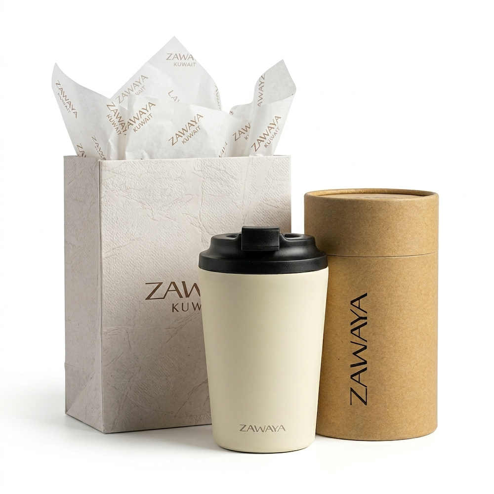 كوب حراري مزدوج الجدار من الستانلس ستييل بسعة 360 ملي مع اسم مطبوع مخصص، بوزن خفيف 205 جرام ويحفظ حرارة المشروبات الباردة أو الحارة من 6 الى 12 ساعة مع غطاء محكم وسطح خارجي مطفي مقاوم للإنزلاق.