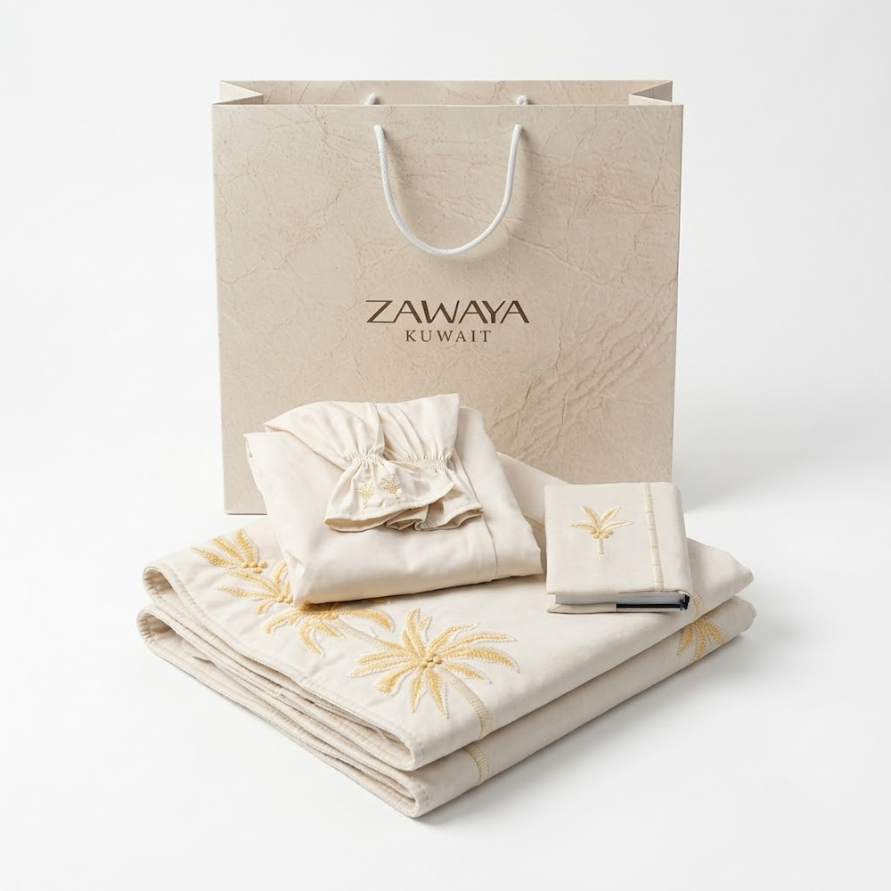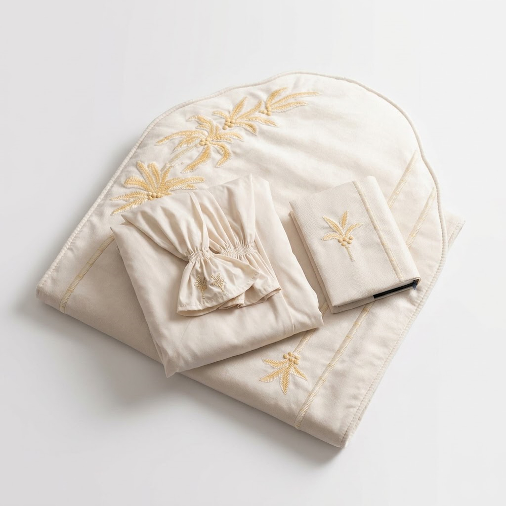 مجموعة صلاة أنيقة تضم سجادة صلاة، عباية صلاة وغلاف مصحف، مصممة للراحة ولمسة أناقة. سجادة الصلاة بقياس 125*70 سم وسماكة 2 سم من الكتان مع تطريز مستوحى من النخيل. عباية الصلاة خفيفة بمقاس حر من 80٪ بوليستر و 20٪ قطن وتاتي مع غطاء راس مطابق. غلاف المصحف من كتان فاخر بمقاس 21*15 سم. مقدمة في بوكس هدايا رمضاني فاخر بمقاس 50*35*13 سم، جاهزة للإهداء.