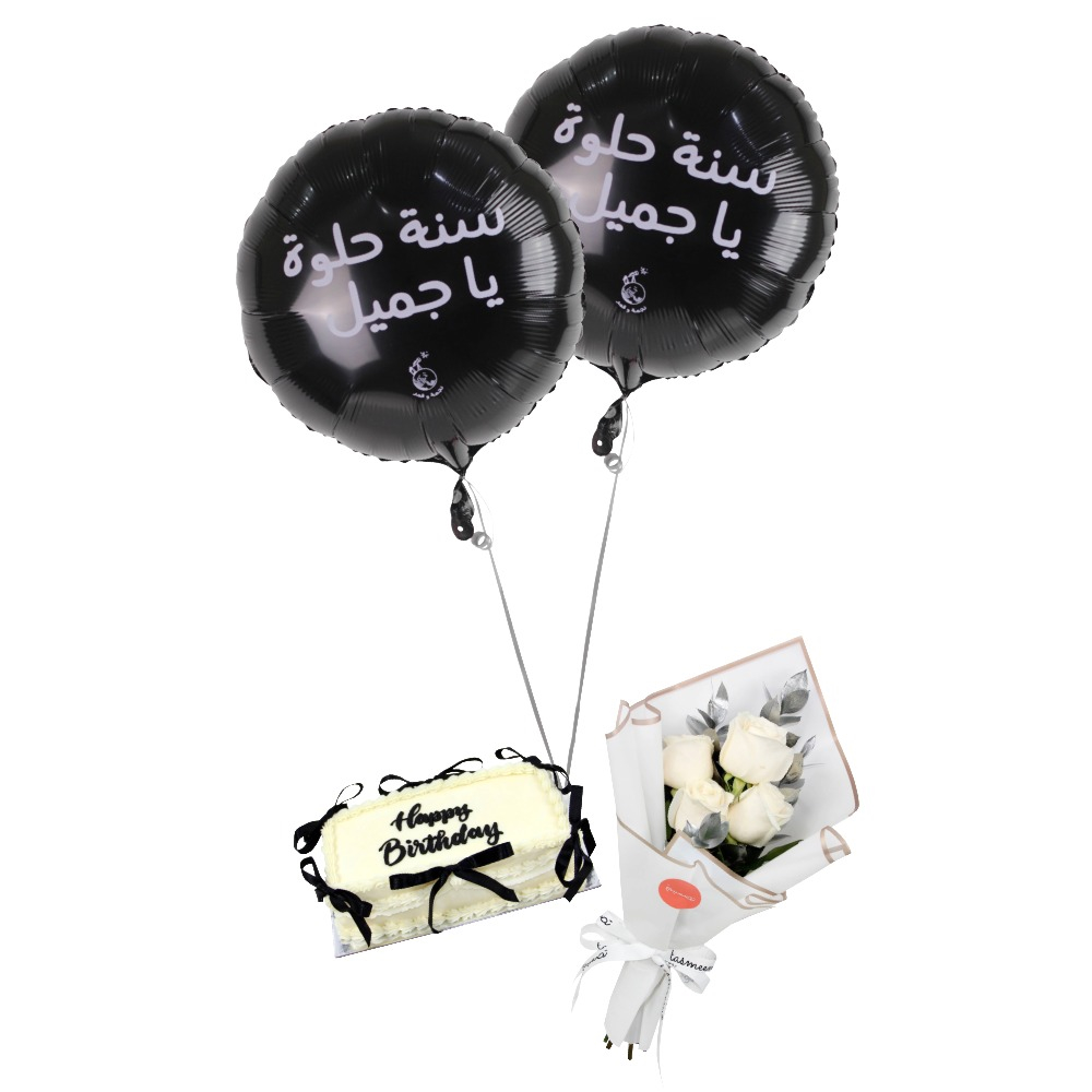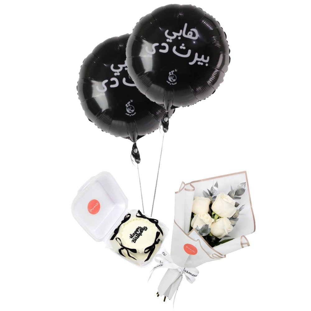 تنسيق احتفالي يضم كيكة مع باقة أزهار وبالونات.