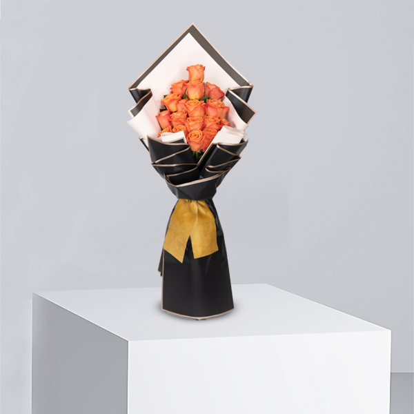 احتفل بالحب مع الزهور. قد يكون تقديراً لصديق، وعلامة تهنئة على إنجاز مستحق، وذكرى سنوية. هذه الباقة هي الهدية المثالية لتوصيل رسالتك. حديثة في الشكل ومعاصرة بمشاعر كلاسيكية. تنسيق من الزهور الأكوادورية المقطوعة حديثًا من مزرعة المزارعين مباشرةً. 25 قطعة من زهور الجوري البرتقالية. منسقة بعناية ودقة ومغطاة بورق أسود اللون. مزينة بفيونكة مخملية كبيرة.