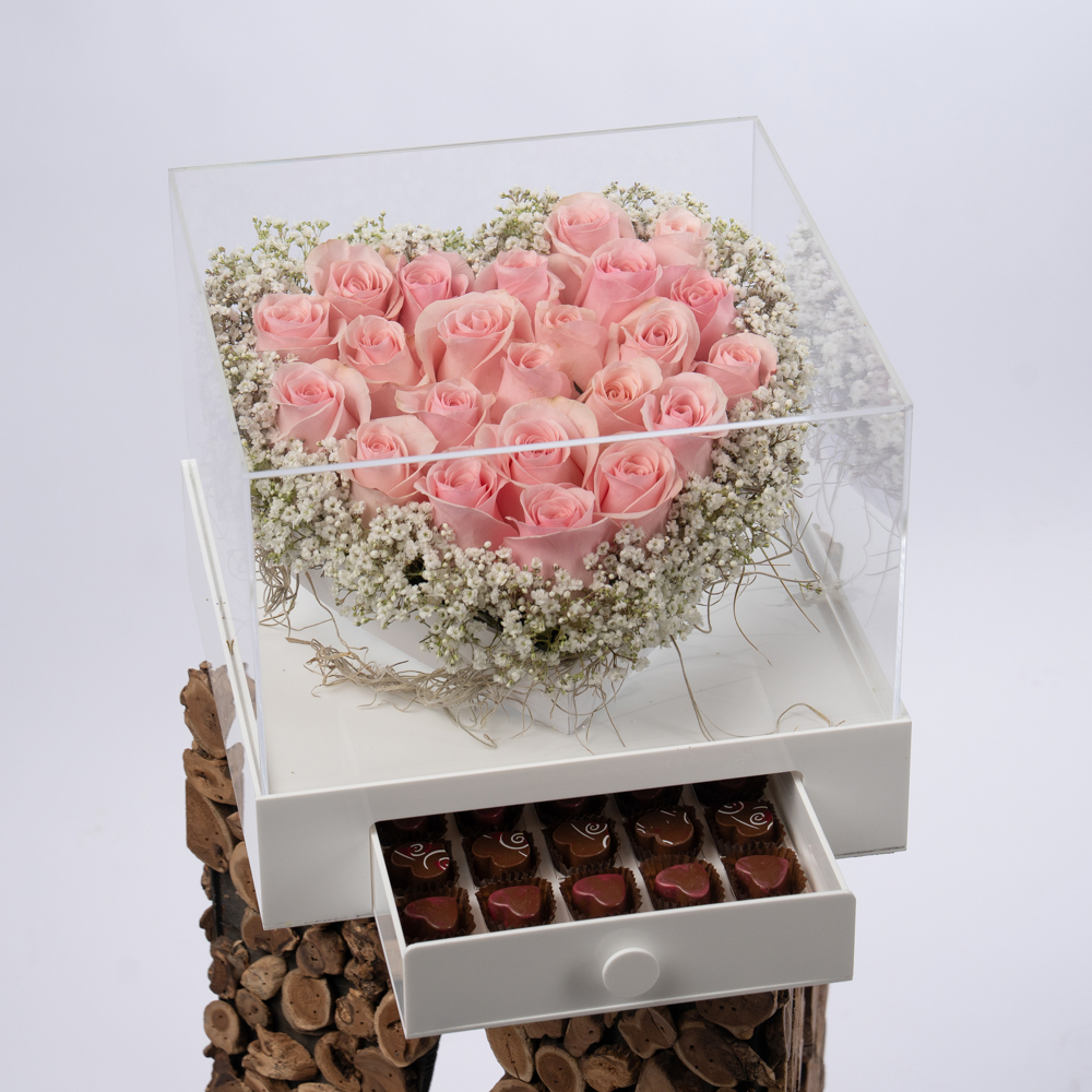 صندوق كبير وراقي منسق بشكل قلب بالجوري وفيه درج مليء بالشوكولاتة.