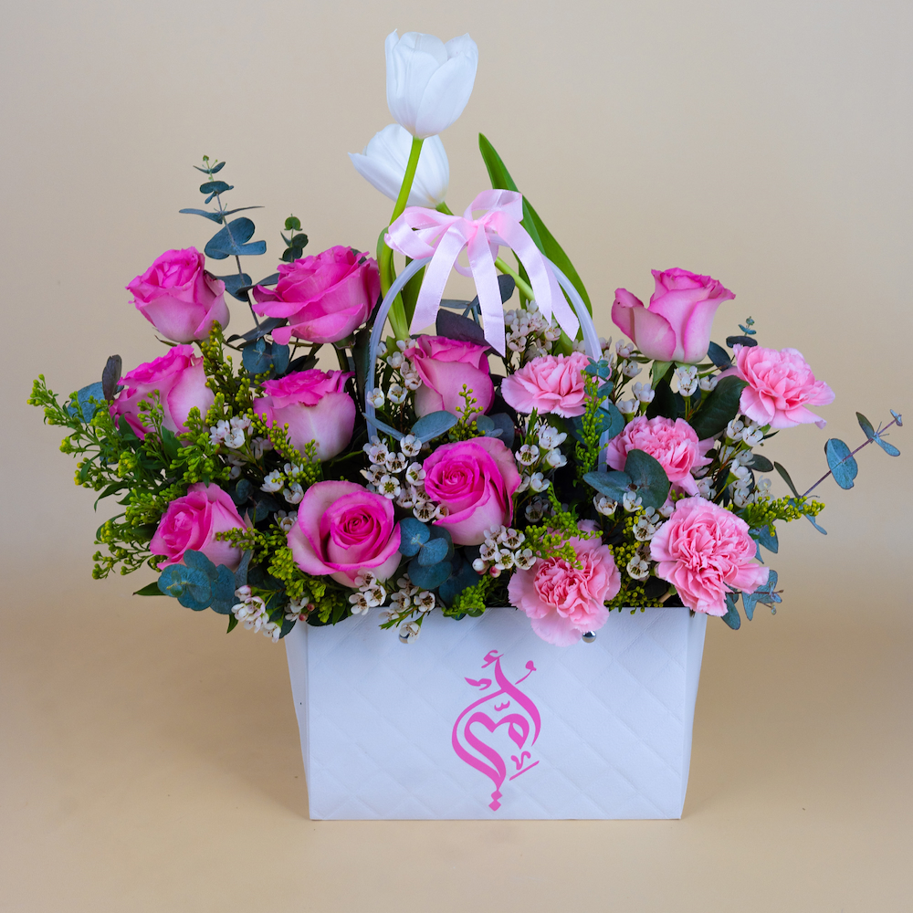 تقديم عناق دافئ لوالدتك مع حقيبة زهور الأحضان للأم، وهي تنسيق مذهل من الورود الوردية والقرنفل والتوليب والأوكالبتوس والصلداقو وزهور الشمع، معروضة بأناقة في حقيبة هدايا عصرية، هذه الهدية الزهرية الجميلة هي الطريقة المثالية للتعبير عن الحب والتقدير في عيد الأم أو أي مناسبة خاصة.