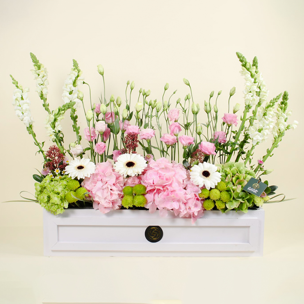 يحتوي هذا البوكيه على هايدرنجا، وسناب دراغون، ويستوما، وسكيميا، وجربيرا، وكريزانتيمم.