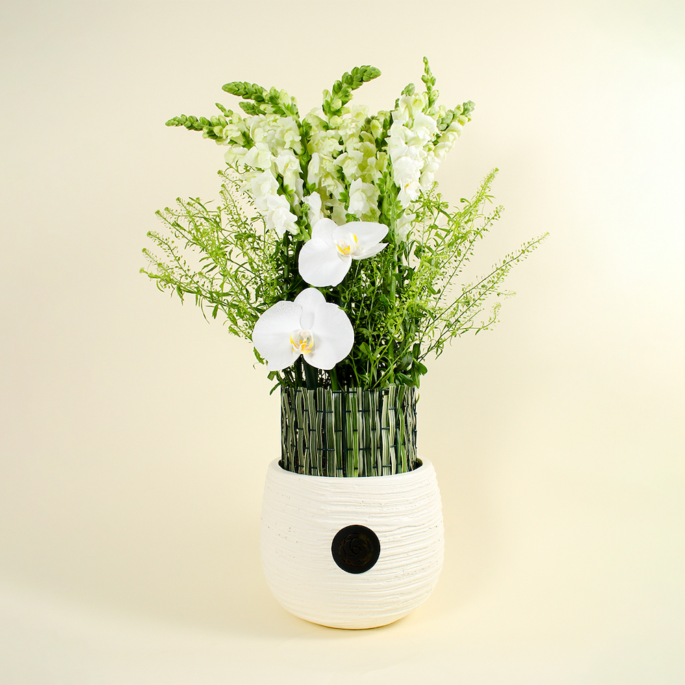 يحتوي هذا البوكيه على سناب دراغون، وعشب الصين، وأزهار فالاينوبسيس، وجرين بيل.