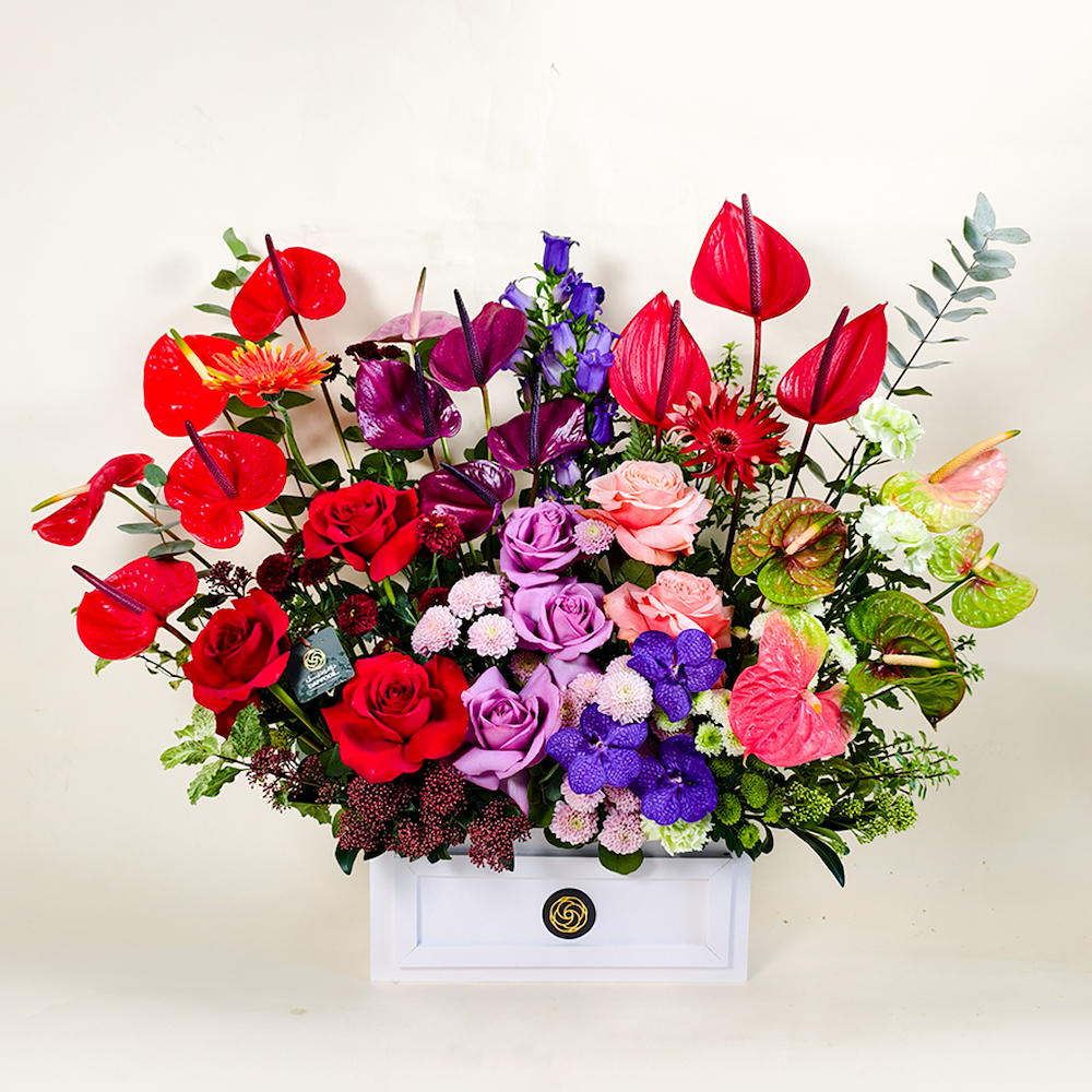 هذه الباقة تحتوي على زهور الجوري، البيبي جوري، الفالانوبسيس والواكس.