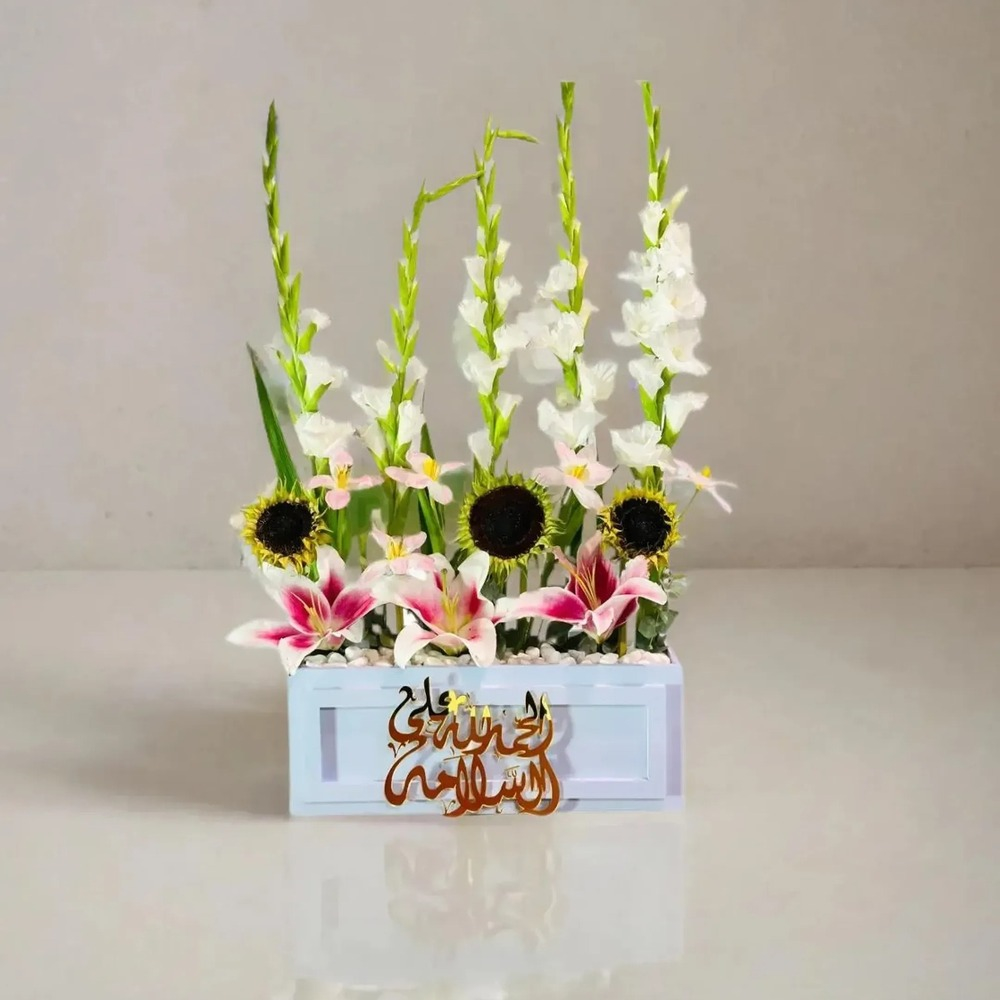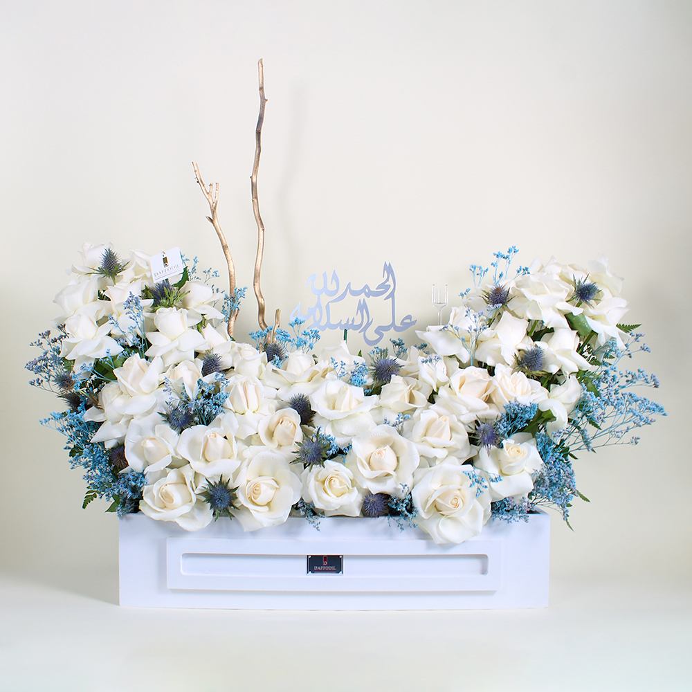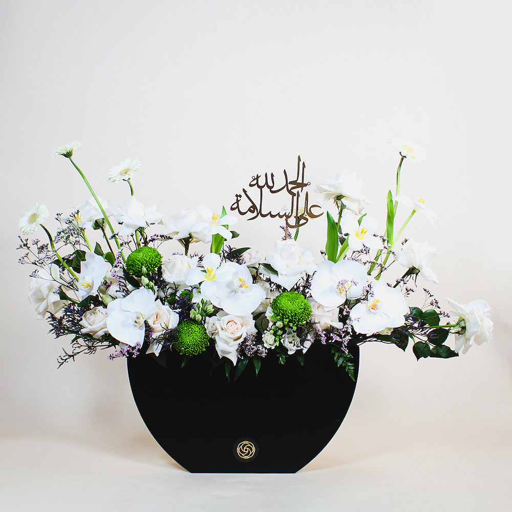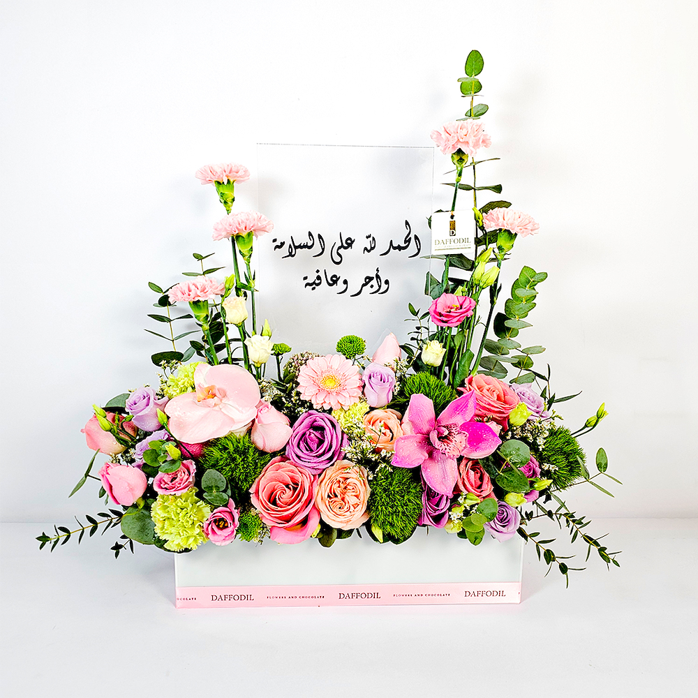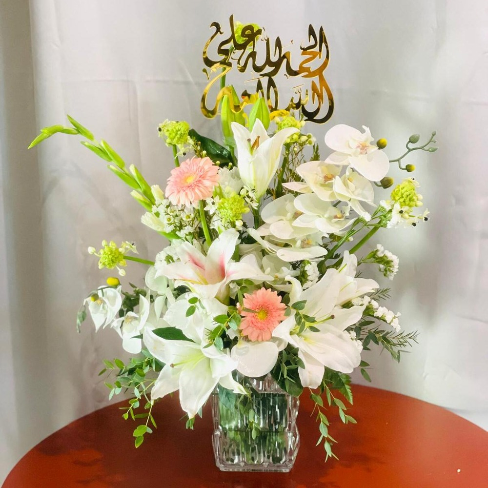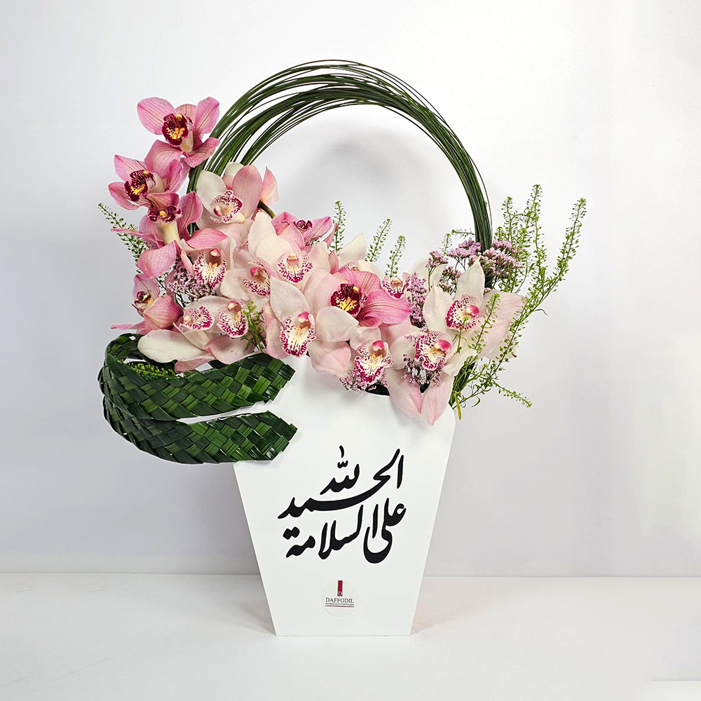 باقة تحتوي على زهور السمبيديوم والليمونيوم مع الستيل جراس.