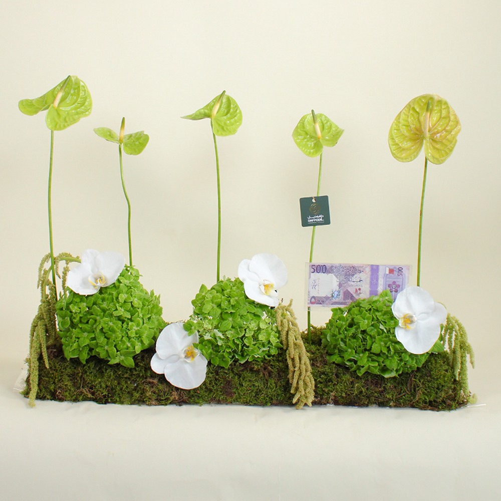 هذه الباقة تحتوي على زهور الأنثوريوم، الأمارانثوس، الهايدرينجا والفالانوبسيس. ملاحظة: النقود غير مشمولة مع الباقة.