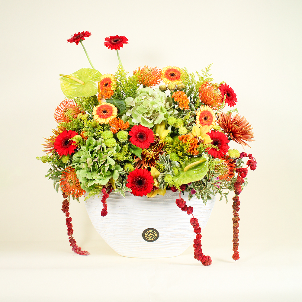 يحتوي هذا البوكيه على هايدرنجا، وجربيرا، وأنثوريوم، وسوليداجو، وديكو، وليوكوسبيرموم.