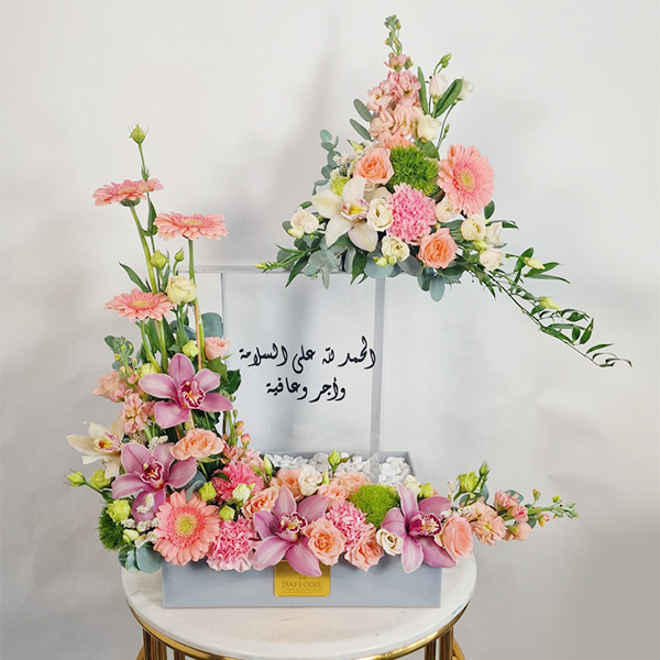 تحتوي هذه الباقة على زهور دوار الشمس، الجوري، البيبي جوري، أوراق زهرة الواكس.