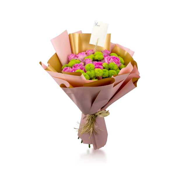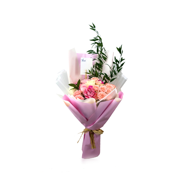 هذه الفازة الأنيقة تحتوي على زهور الجوري، الإستوما والواكس.