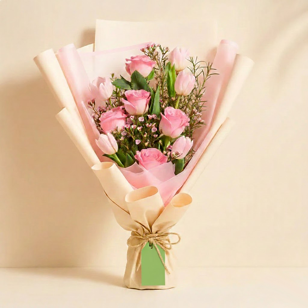 باقة تحتوي على 5 زهور جوري وردية ترمز إلى الرقة والأناقة، و5 زهور توليب وردية تمثل الحب المثالي وتضفي إحساساً منعشاً وحيوياً على التنسيق، وتكملها أوراق الروسكوس الخصبة وزهور الواكس الوردية الرقيقة التي تعزز كثافتها وملمسها، وكلها ملفوفة بشكل جميل في أوراق تغليف بيج ووردية ومربوطة بخيوط الرافيا الطبيعية للحصول على لمسة نهائية ريفية ساحرة.