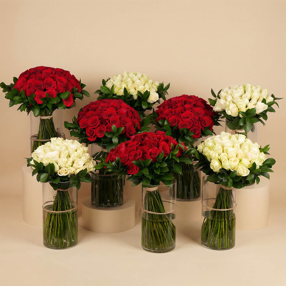 احتفل بالحب الخالد مع هذه المجموعة التي تحتوي على 160 زهرة جوري حمراء، 160 زهرة جوري بيضاء، 80 ورقة من الروسكوس، و8 فازات زجاجية أنيقة.