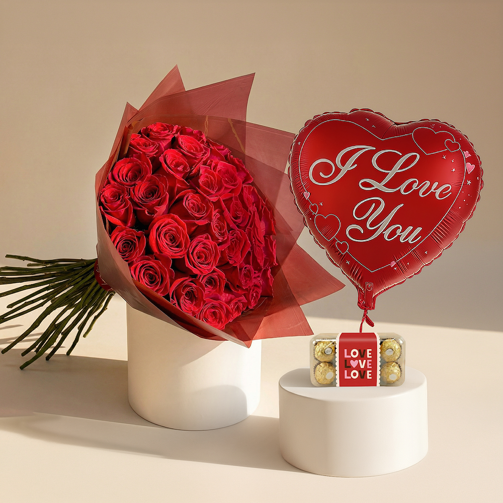 عبر عن حبك بأجمل طريقة مع باقة من زهور الجوري الحمراء الفاخرة، شوكولاتة فيريرو روشيه، بالون الحب. تتضمن هذه الباقة الرائعة 35 زهرة جوري حمراء زاهية، مغلفة ومزينة بشريط أنيق، وبالون على شكل قلب مكتوب عليه "أحبك" للتعبير عن أعمق مشاعرك، وعلبة من 16 قطعة شوكولاتة فيريرو روشيه اللذيذة، مثالية لإسعاد من تحب. هذه الهدية الفاخرة مثالية للإحتفال بالذكرى السنوية، أو أعياد الميلاد، أو أي مناسبة خاصة ترغب في ترك انطباع لا ينسى.