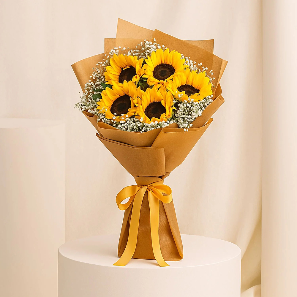 هذه الباقة من زهور دوار الشمس تضفي لمسة من الأناقة والرقي. مثالية للإحتفالات، للتعبير عن الحب، أو ببساطة لإضفاء البهجة على يوم أحدهم.