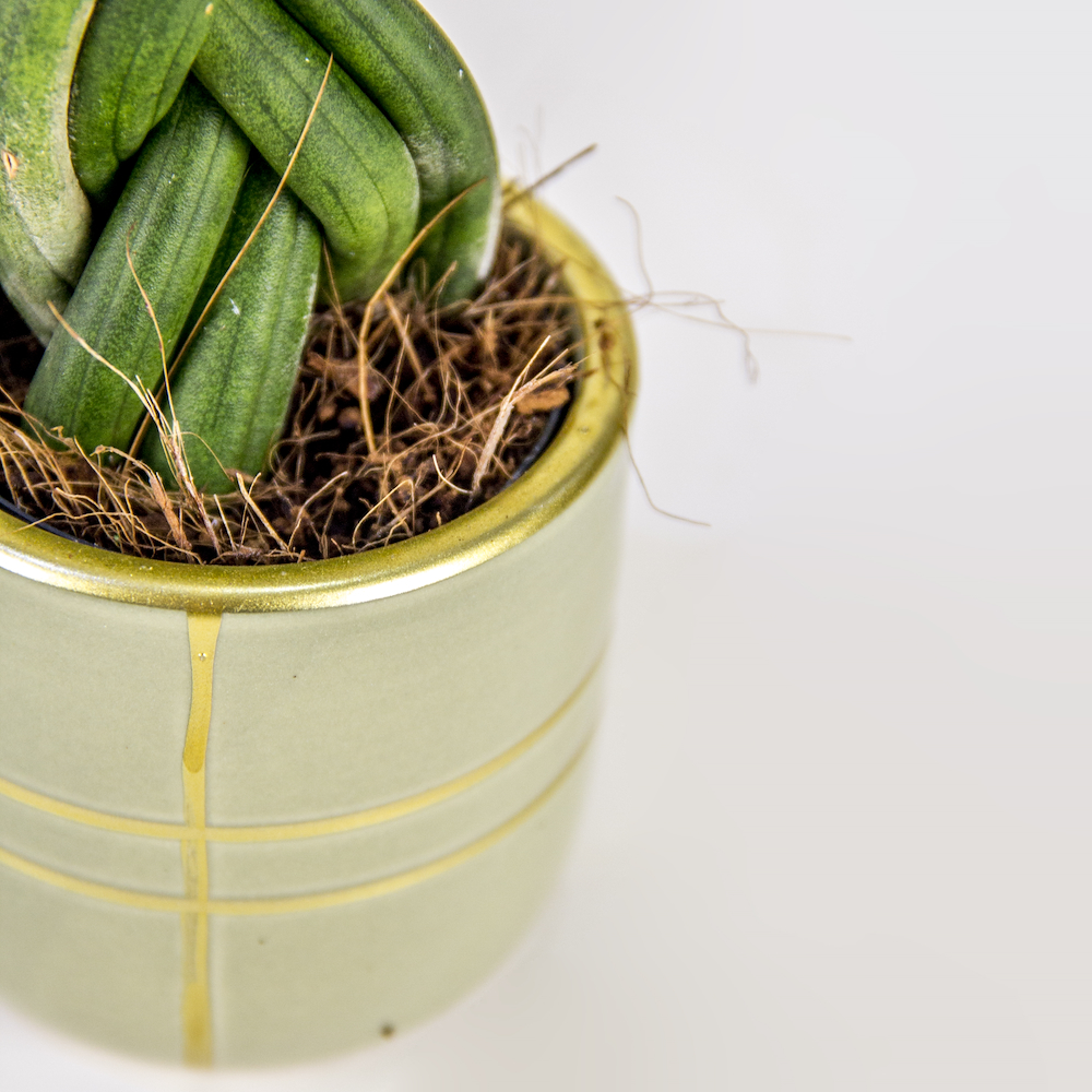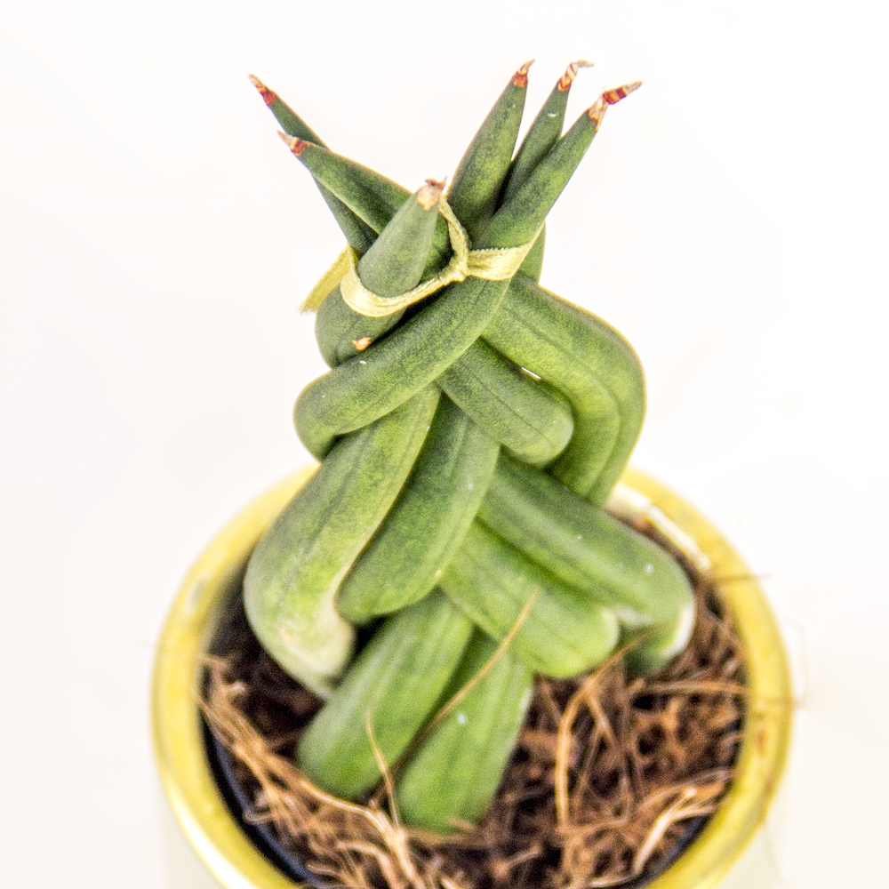 نبتة منزلية رائعة، بتصميم معماري فريد، تتميز بأوراقها الأسطوانية السميكة المضفرة يدويًا بدقة متناهية لتشكل برجاً أنيقاً. موضوعة في أصيص عصري من السيراميك بلون أخضر حكيمي بخطوط مذهبة، لتضفي لمسة جمالية مميزة لا تحتاج إلى عناية.