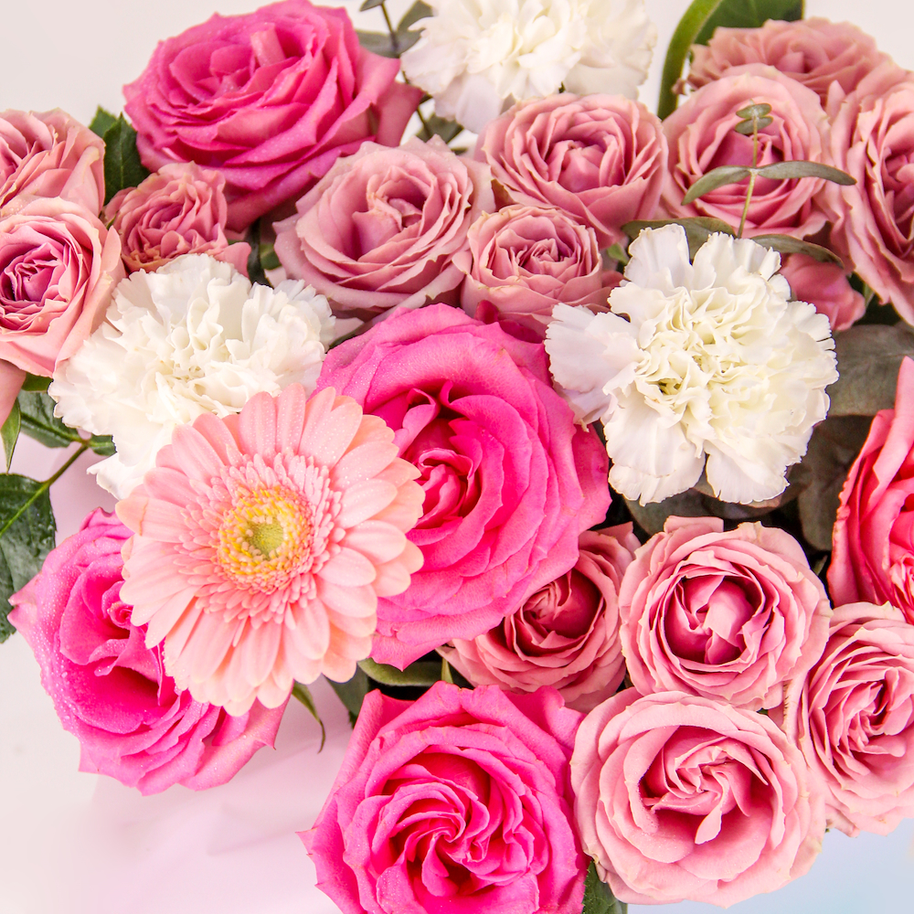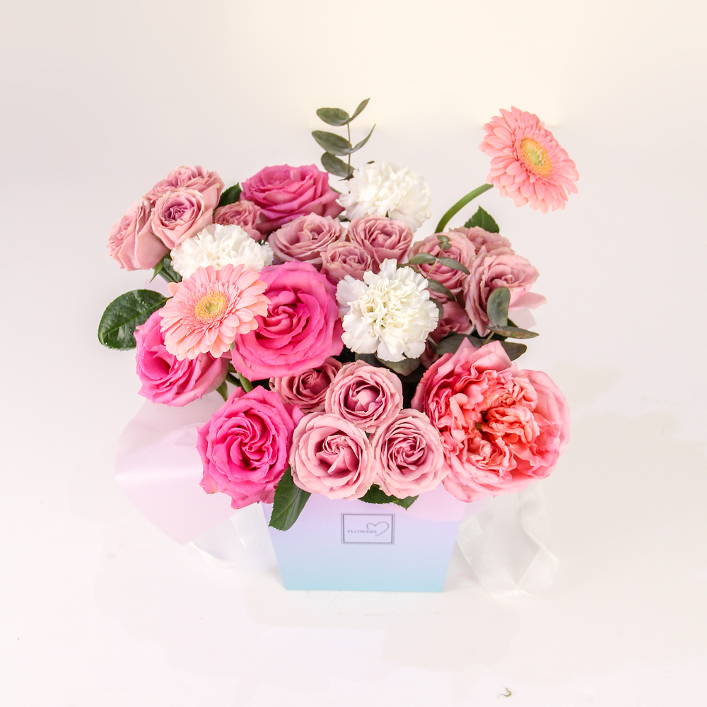 تنسيقة زهور مربعة بمزيج من زهور الجوري، الجيربيرا والكارنيشن، مقدمة في علبة فريدة بتدرجات لونية من الأزرق الفاتح إلى الوردي.