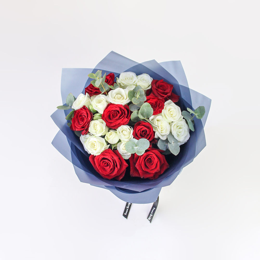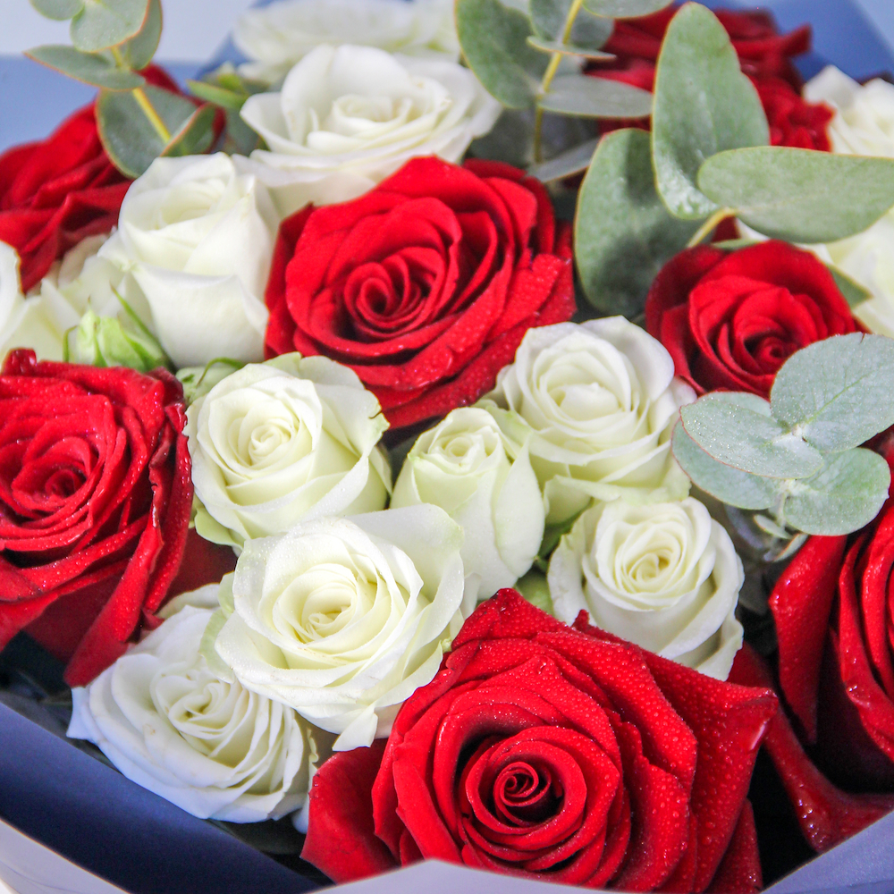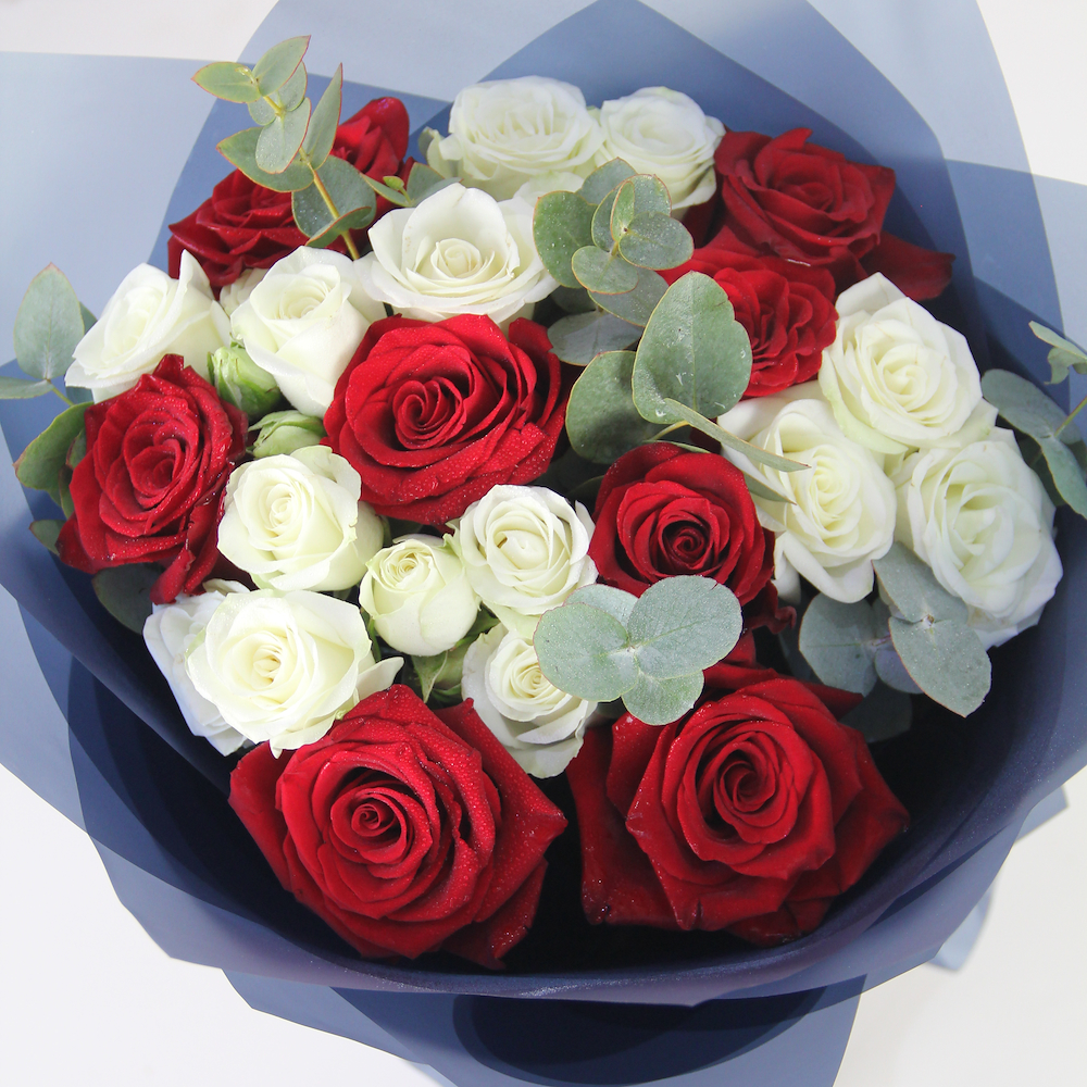 مزيج كلاسيكي من الجوري الأحمر والأبيض ملفوفة بورق أزرق أنيق، ومزينة بأوراق الأوكالبتوس.