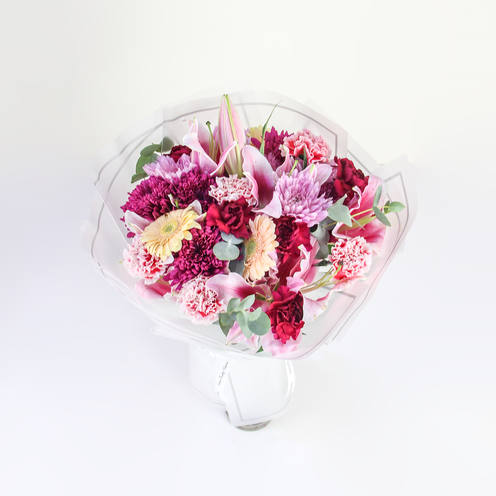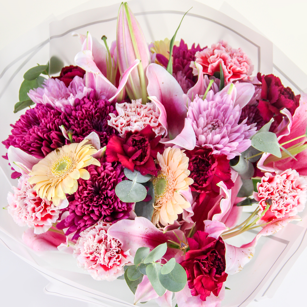 باقة غنية وغنية بألوانها الغنية والعميقة. تتميز هذه الباقة زهور الليلي الجميلة، الجوري المشرقة، الكريز المذهلة والجيربيرا المبهجة، مما يخلق لمسة ساحرة لا تنسى لأي مناسبة رائعة.