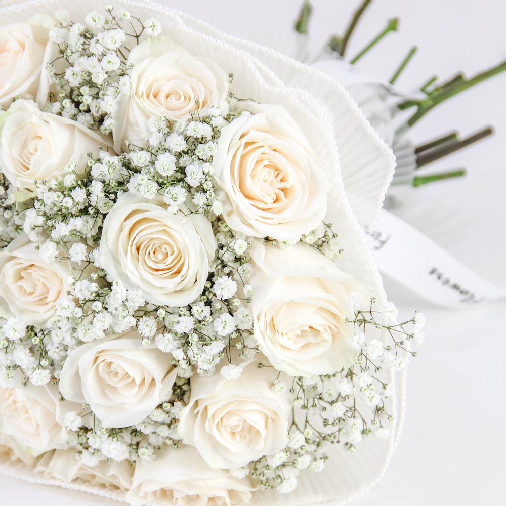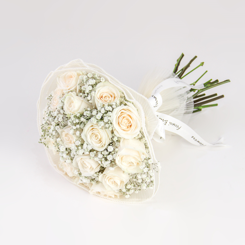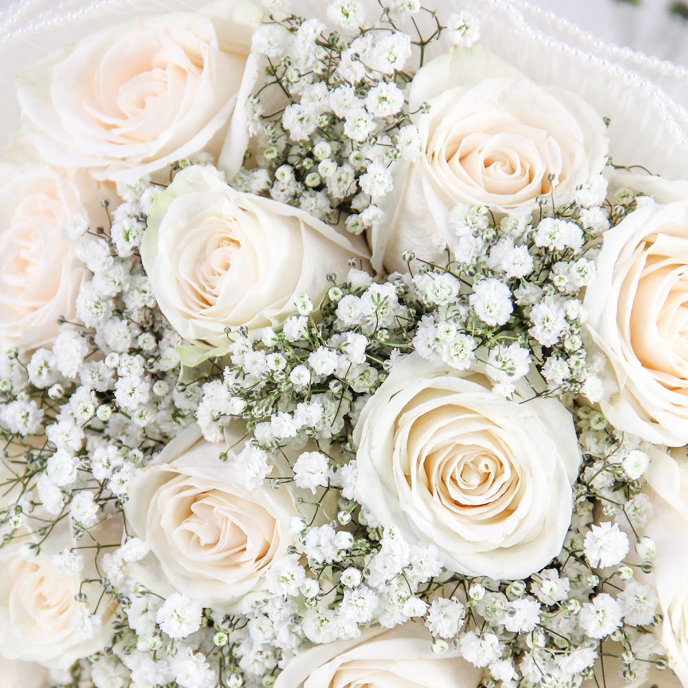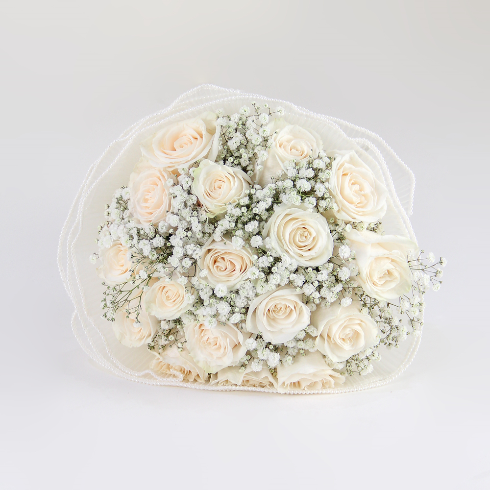 مزيج خالد من زهور الجوري والجبسوفيلا الناعمة، يرمز إلى الحب والنقاء الأبديين. هذه الباقة، المغلفة بشبكة بيضاء رقيقة، مثالية لعروض الزواج، أو إحتفالات الذكرى السنوية، أو حتى لحظات الزفاف الكلاسيكية.