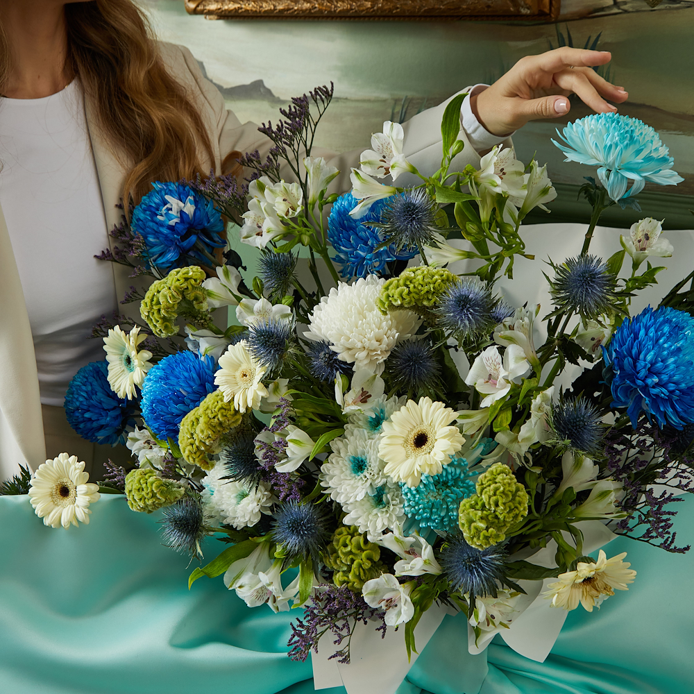 شريط زهري بلون أزرق تيفاني مع مزيج فريد من زهور الكارنيشن والجيربيرا.
