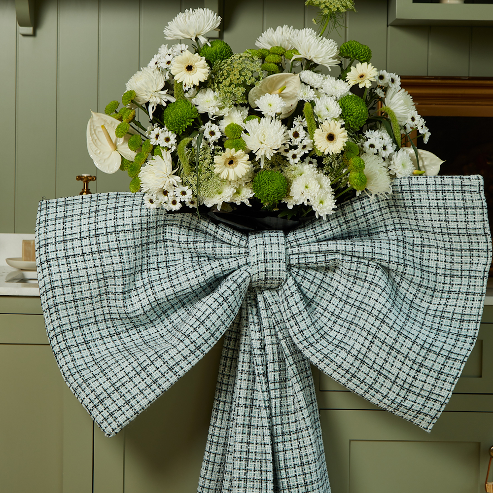 فيونكة شتوية ملفوفة حول تشكيلة مميزة من زهور الجيربيرا، الكريز والأنثوريوم البيضاء.