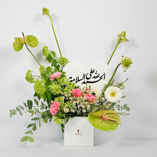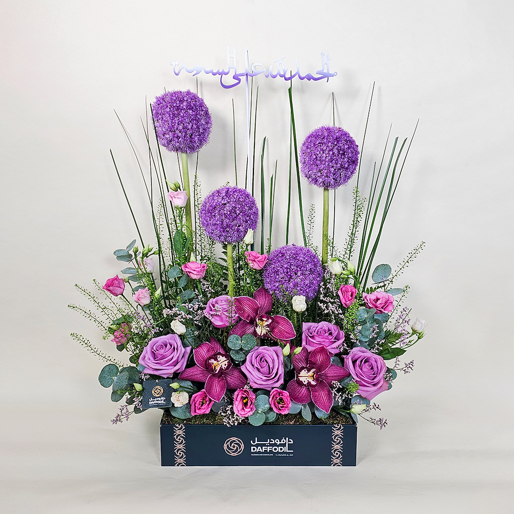 هذه الباقة تحتوي على زهور عباد الشمس، الليلي والغلاديولوس.
