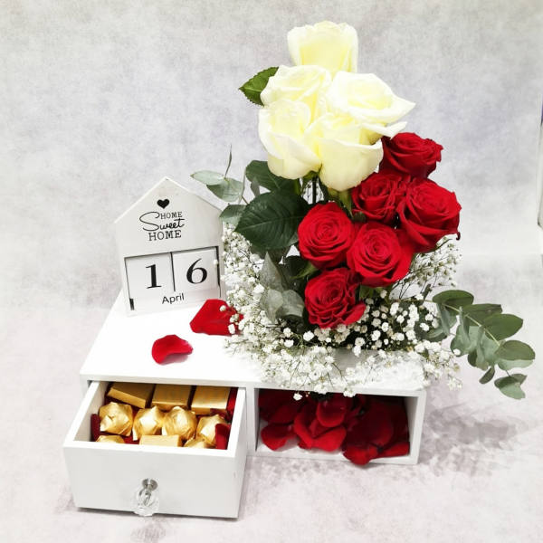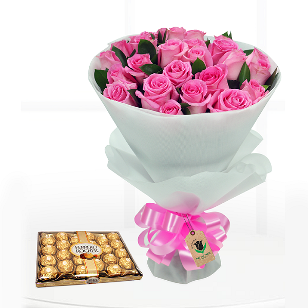 هذه الباقة تحتوي على الجوري الوردي مع شوكولاتة فيريرو روشيه.