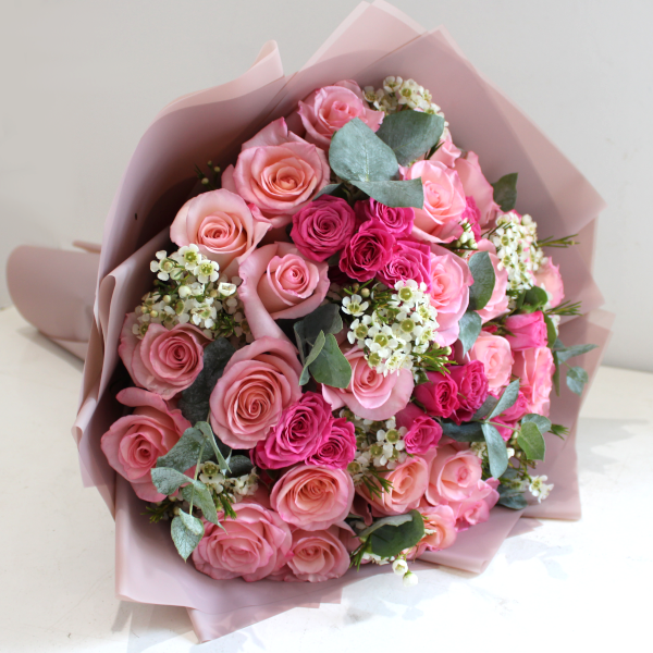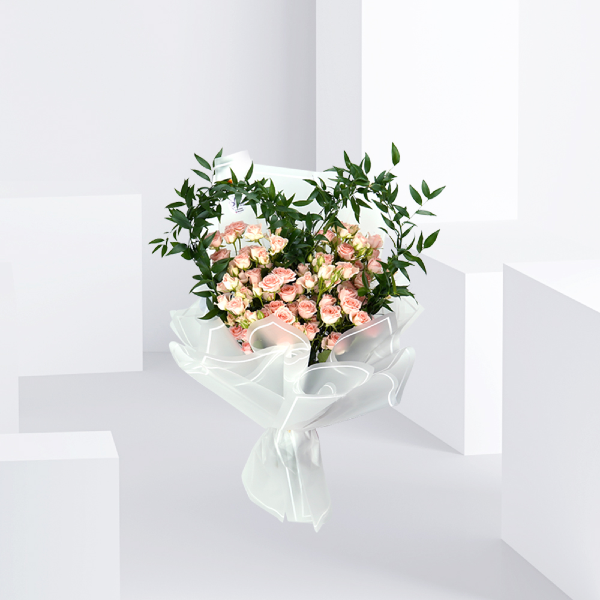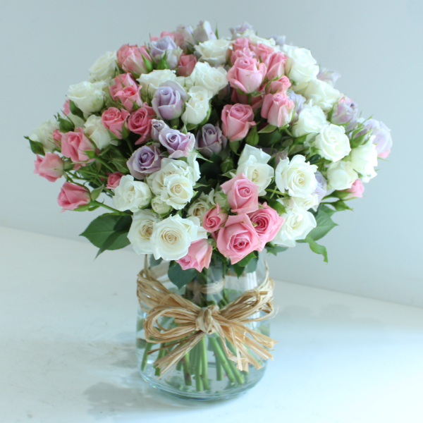 هذا تنسيق زهور فاخر يحتوي على زهور التوليب، الكريز والأنثوريوم أنيقة، تكملها ديكورات بيضاء متطورة، وتقدم في وعاء خشبي جميل.