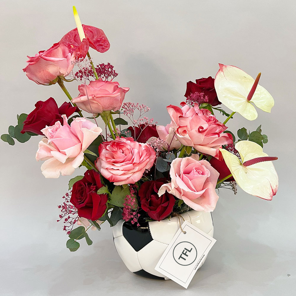 تحتوي هذه الباقة على زهور الجوري والأنثوريوم المنسية فوق كرة قدم، نصف معبئة بالهواء.