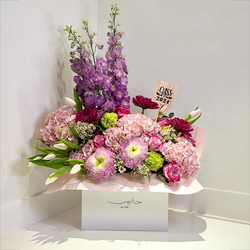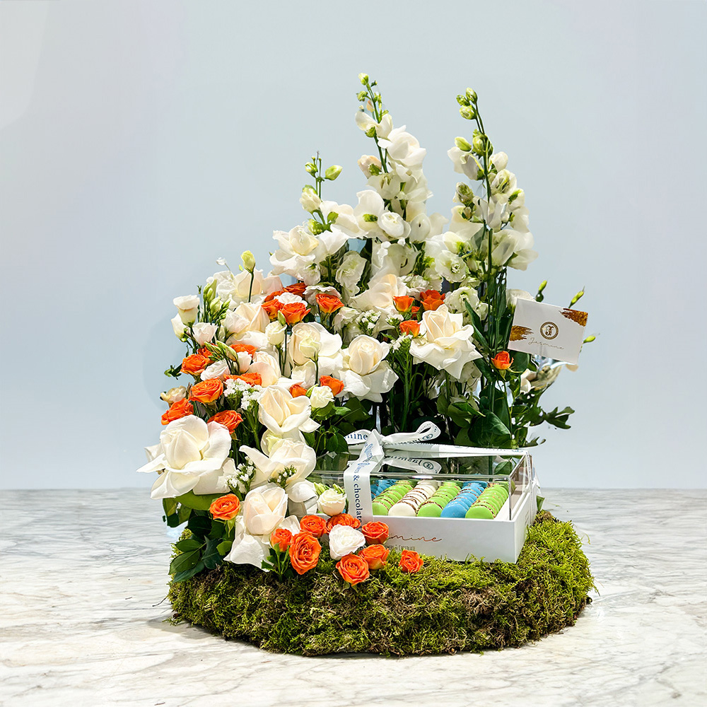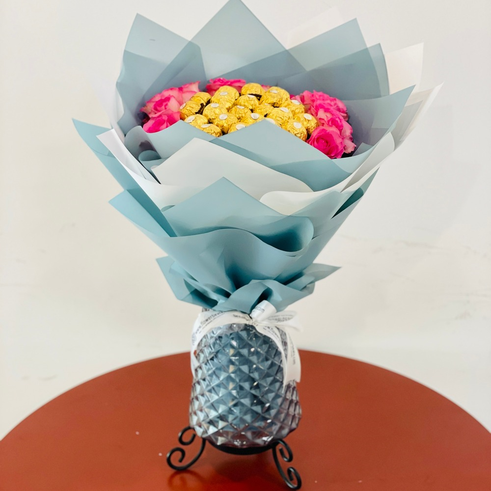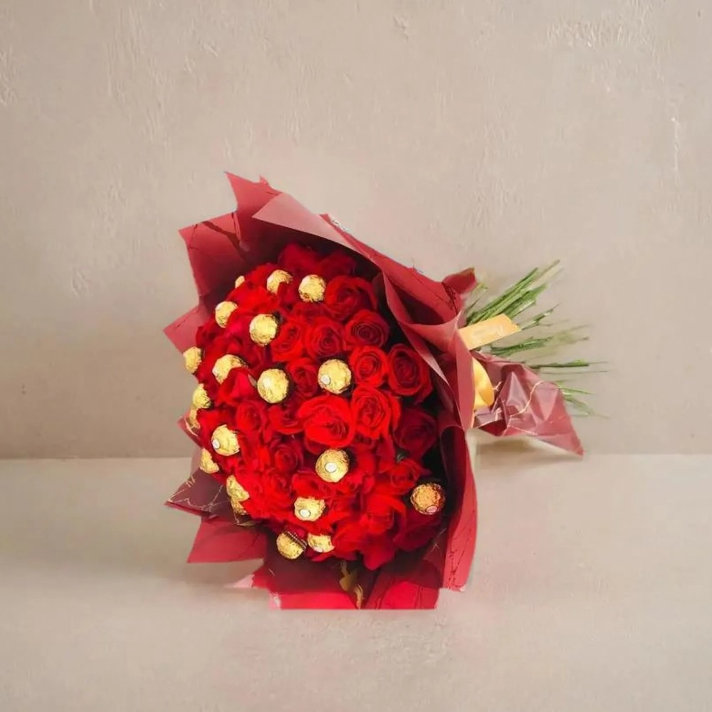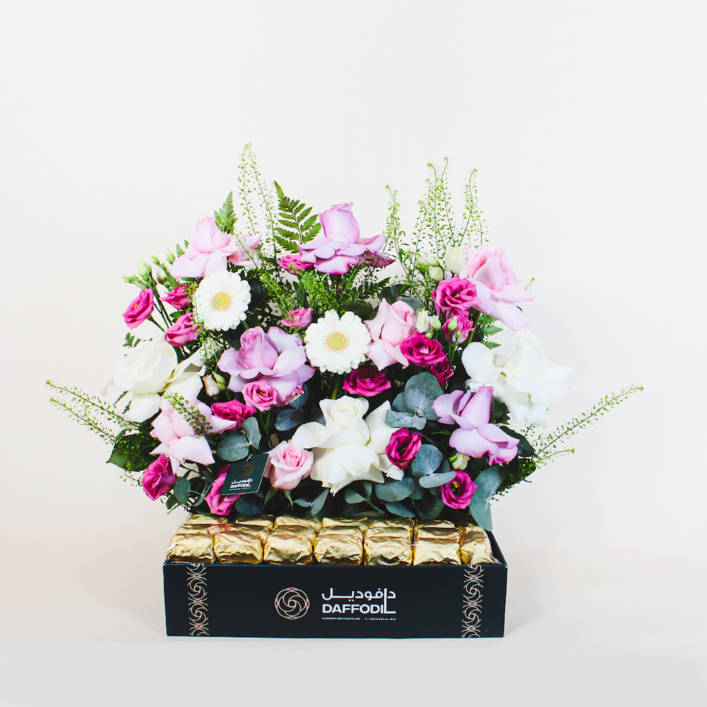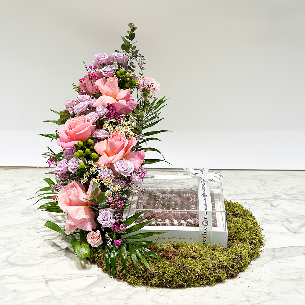 هذه الصينية تحتوي على زهور الجوري مع الشوكولاتة.
