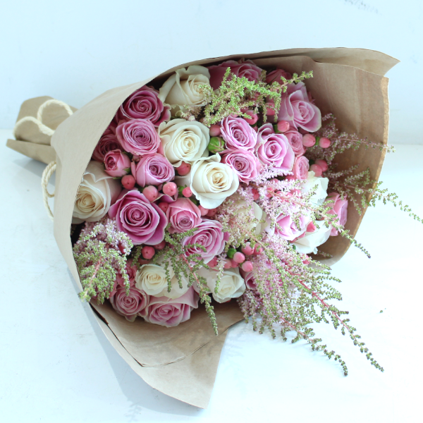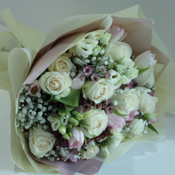 هذه الصينية تحتوي على زهور التوليب، الجيربيرا، الكارنيشن، الليمونيوم والواكس مع علبة من الأكريليك للهدايا النقدية.