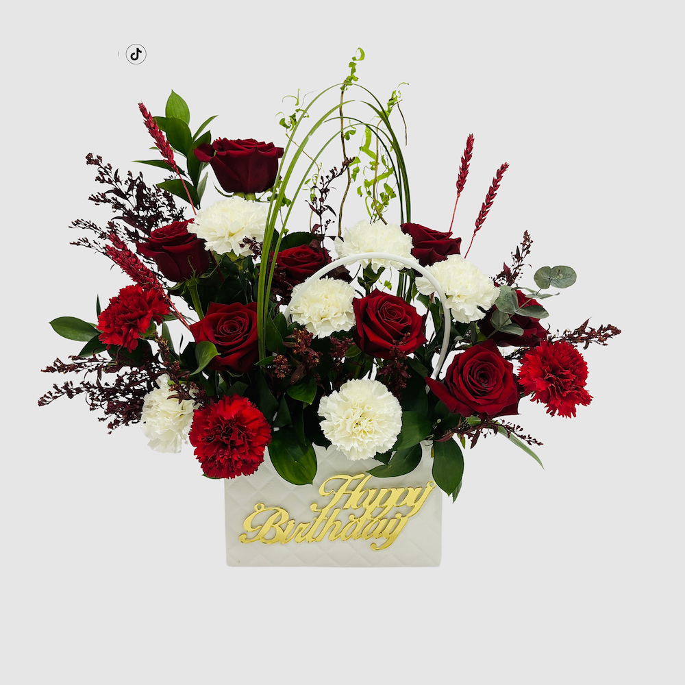 بوكس مليئ بأزهار الجوري، الكارنيشن، وأوراق الروسكس مع تغريسة.