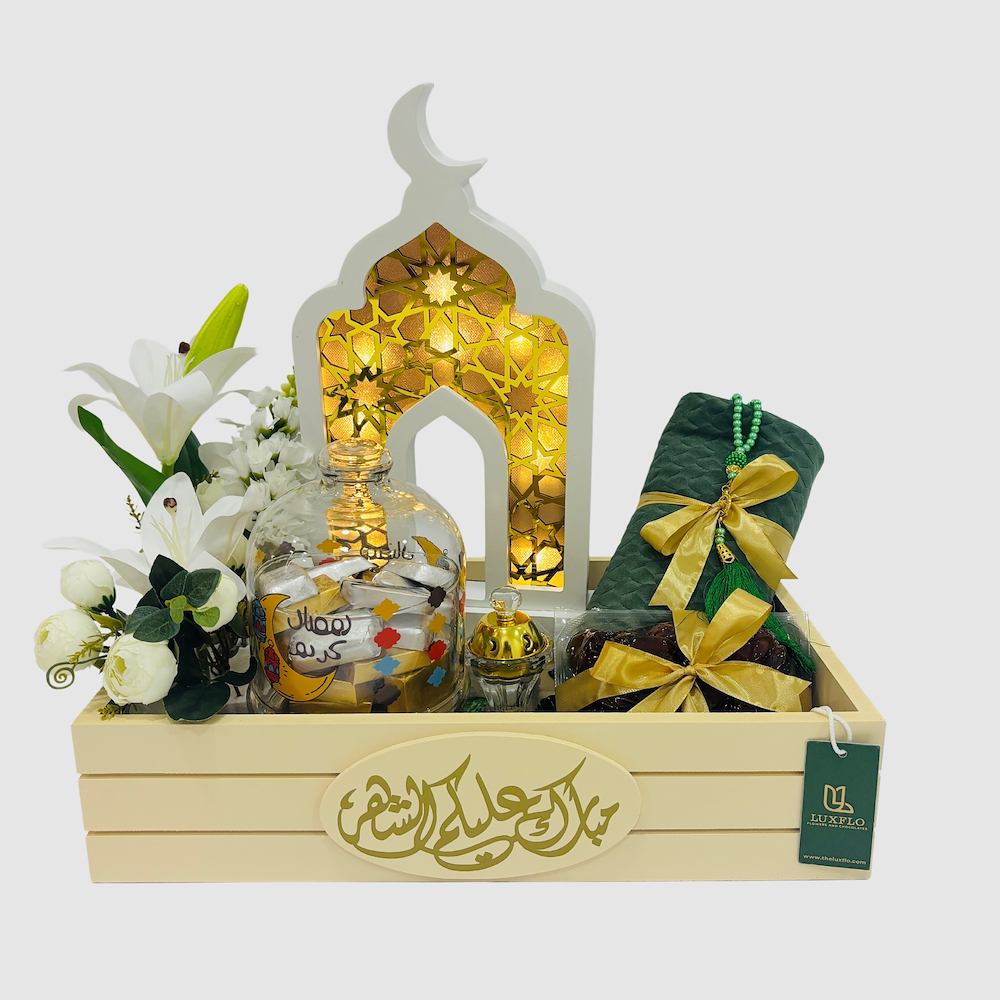 بوكس يحتوي على أزهار الليليز والجوري مع سجادة صلاة، مسبحة، 500غ تمر فاخر، مبخرة، 500غ الشوكولاتة الفاخرة وفانوس رمضان.