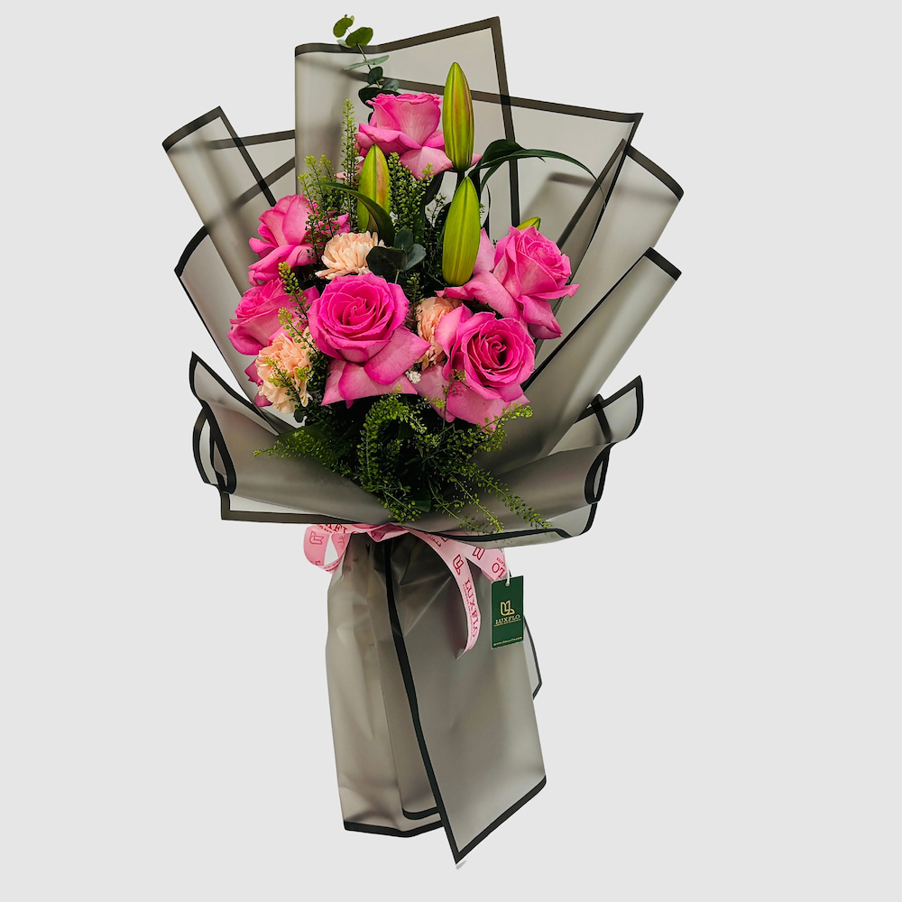 باقة يد تحتوي على الجوري، البيبي جوري والجيبسوفيلا.