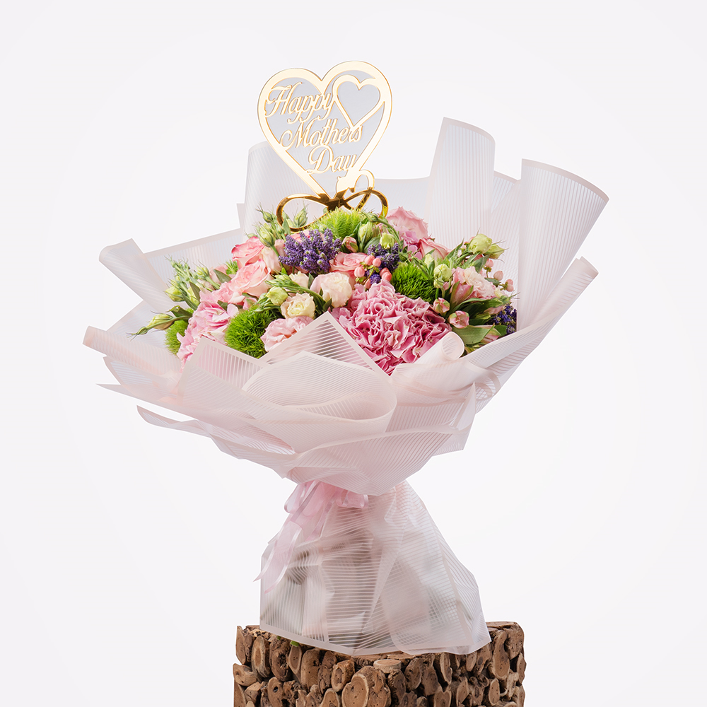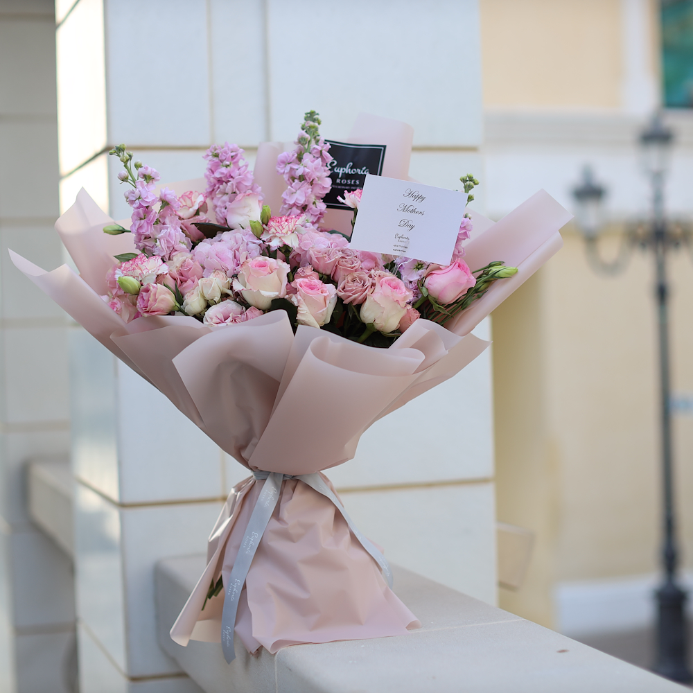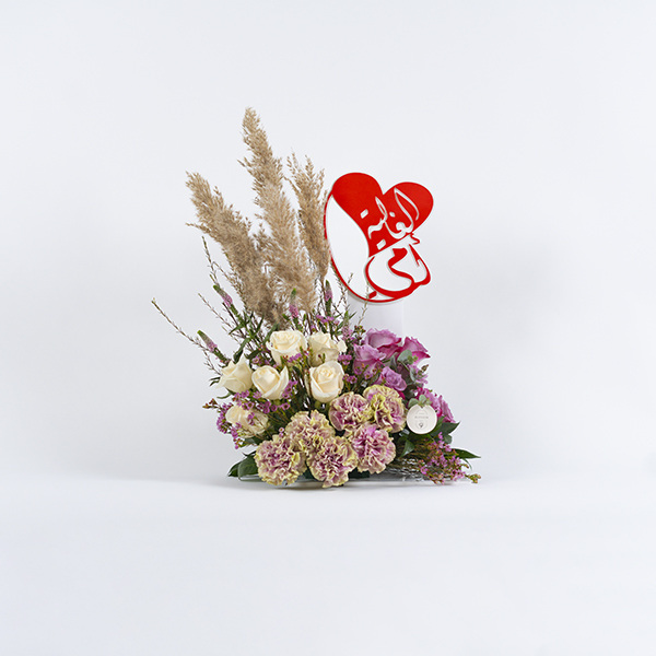 ستاند مصنوع بشكل جميل يحمل تنسيقاً أنيقاً من زهور الجوري، الجيربيرا، الإستوما والدلفينيوم، مزينة بالأوراق الخضراء.