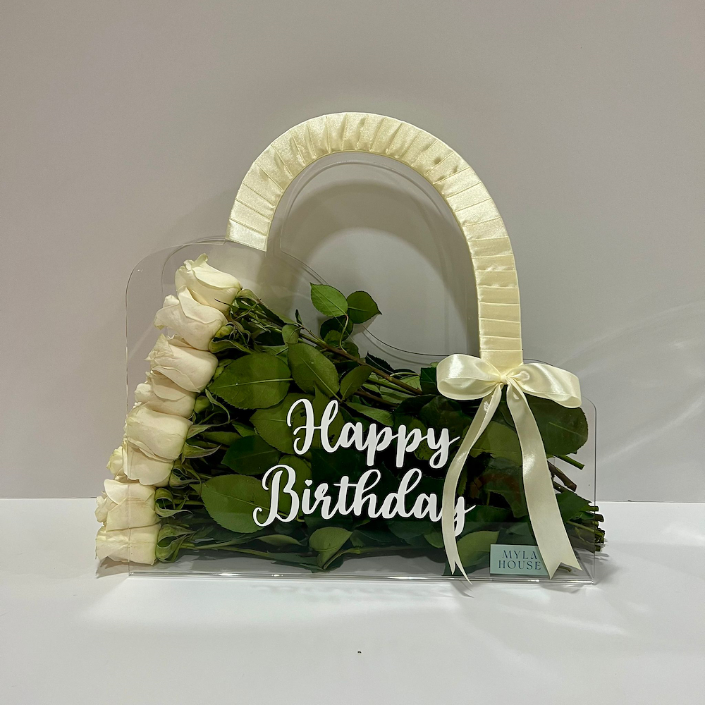 باقة جوري أبيض أنيق في حقيبة شفافة بتفاصيل فاخرة، مناسبة للاحتفال بأجمل المناسبات.