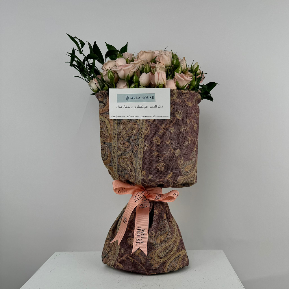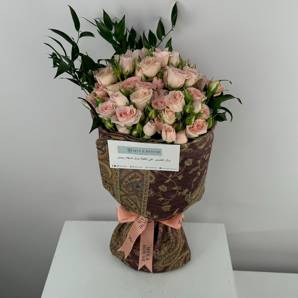 باقة من البيبي روز مغلفة بوشاح وردي كلاسيكي، تعطي للتنسيق حضور مرتّب ونظيف مناسب للهدايا الراقية.