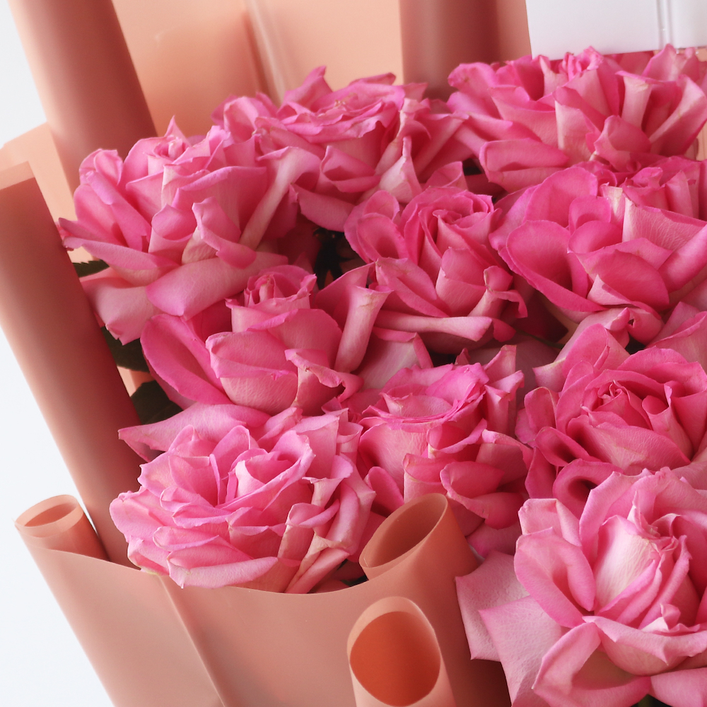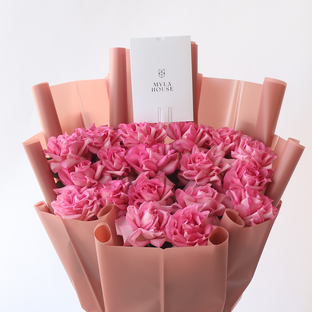 تنسيق فخم من الورود الوردية الكثيفة بتغليف وردي مطفّي يمنح طابعاً راقياً وجذاباً.