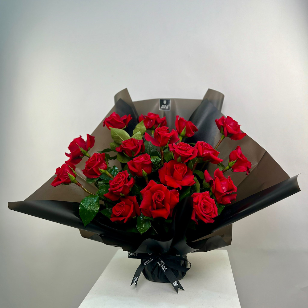 باقة فاخرة من الجوري الحمراء الملفوفة بالأسود لإطلالة راقية وجذابة.