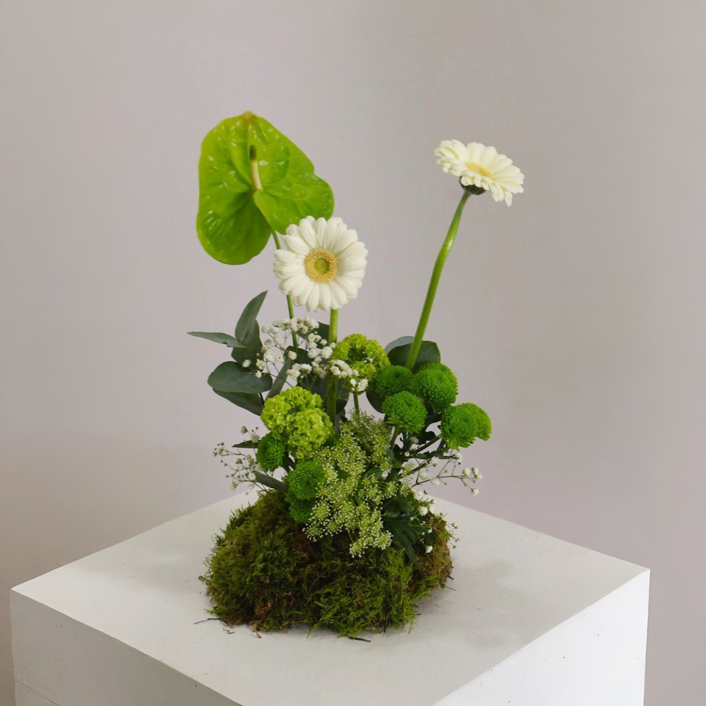 تنسيق طبيعي على قاعدة خضراء مع جربيرا بيضاء وأوراق خضراء منعشة.