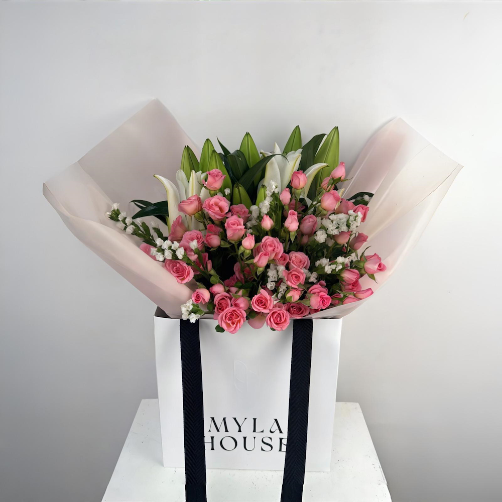 جوري وردية وبيضاء، مزيج يفيض بالحب والجمال النقي.