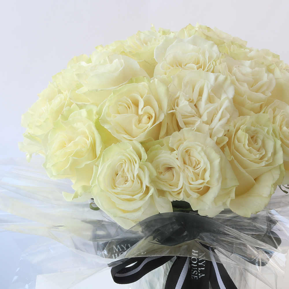 باقة فاخرة من الجوري الأبيض مرتبة بكثافة داخل فازة زجاجية بشريط مميز.