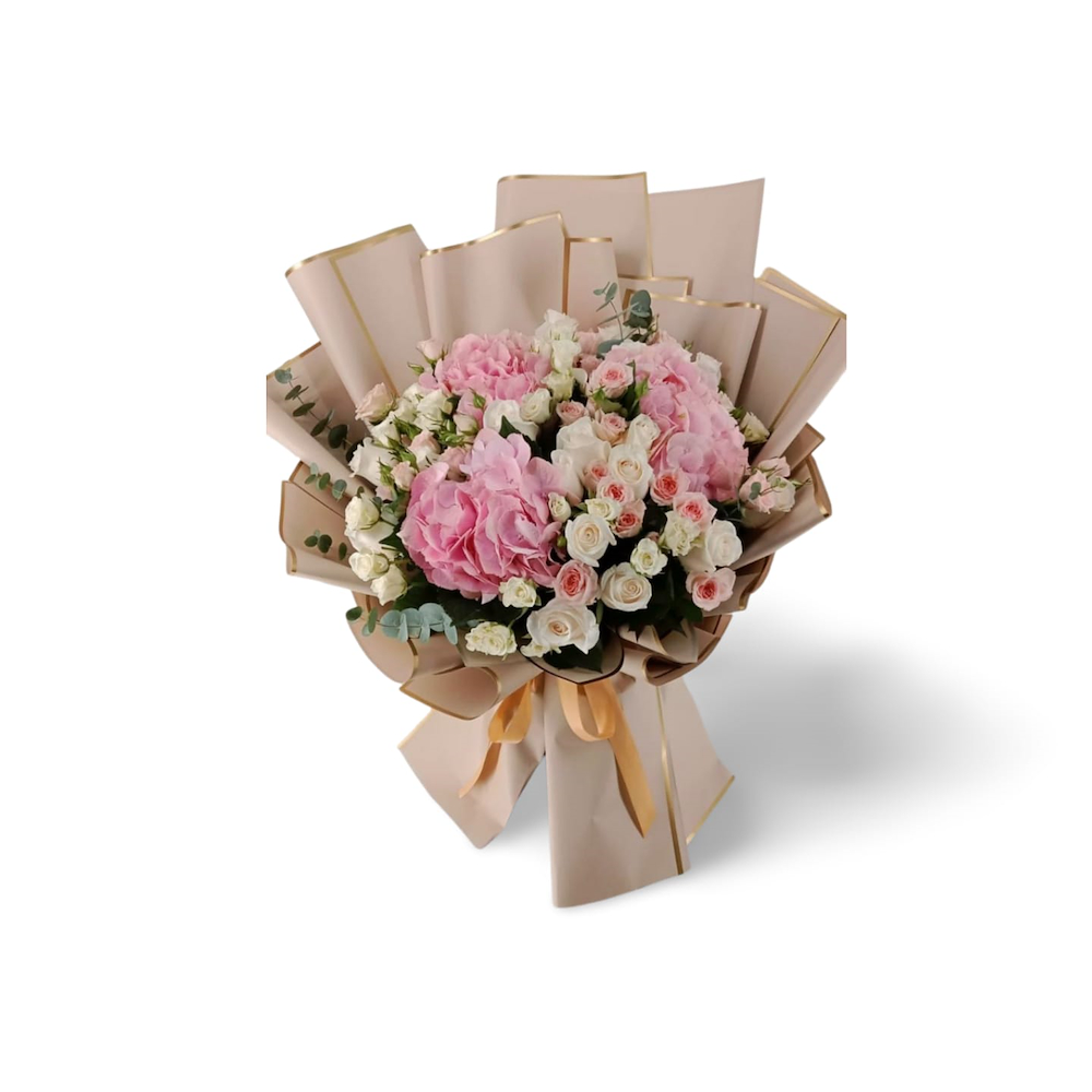 باقة يد تحتوي على الجوري والهايدرنجا.