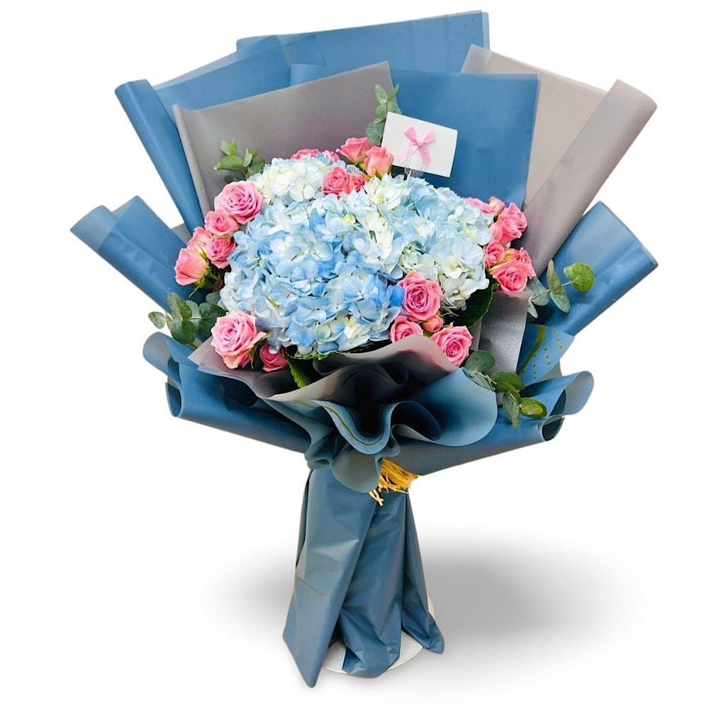 باقة مرتبة بزهور الهايدرينجا الزرقاء والبيبي جوري الوردية، مع لمسة من اللون الأخضر، ملفوفة في غلاف أزرق ورمادي ومزينة بشريط. هذه الباقة هي الهدية المثالية لأي مناسبة.