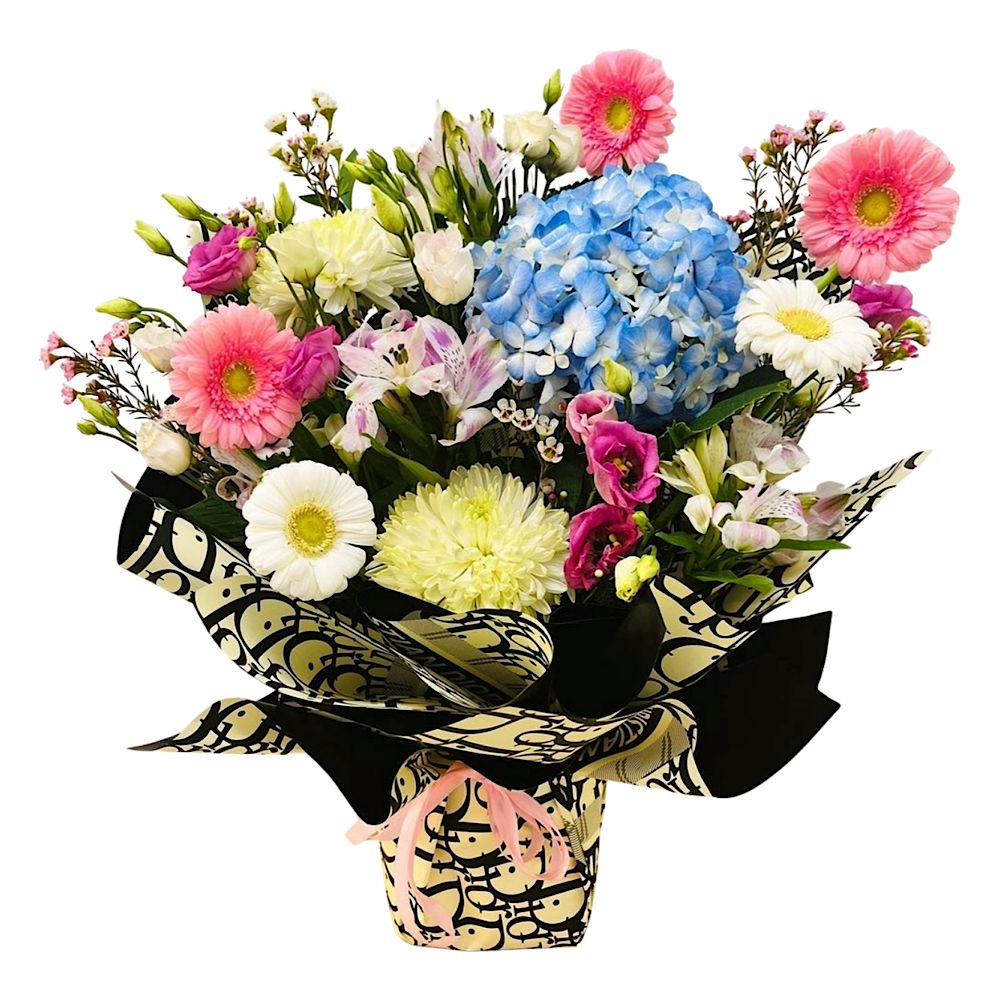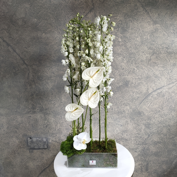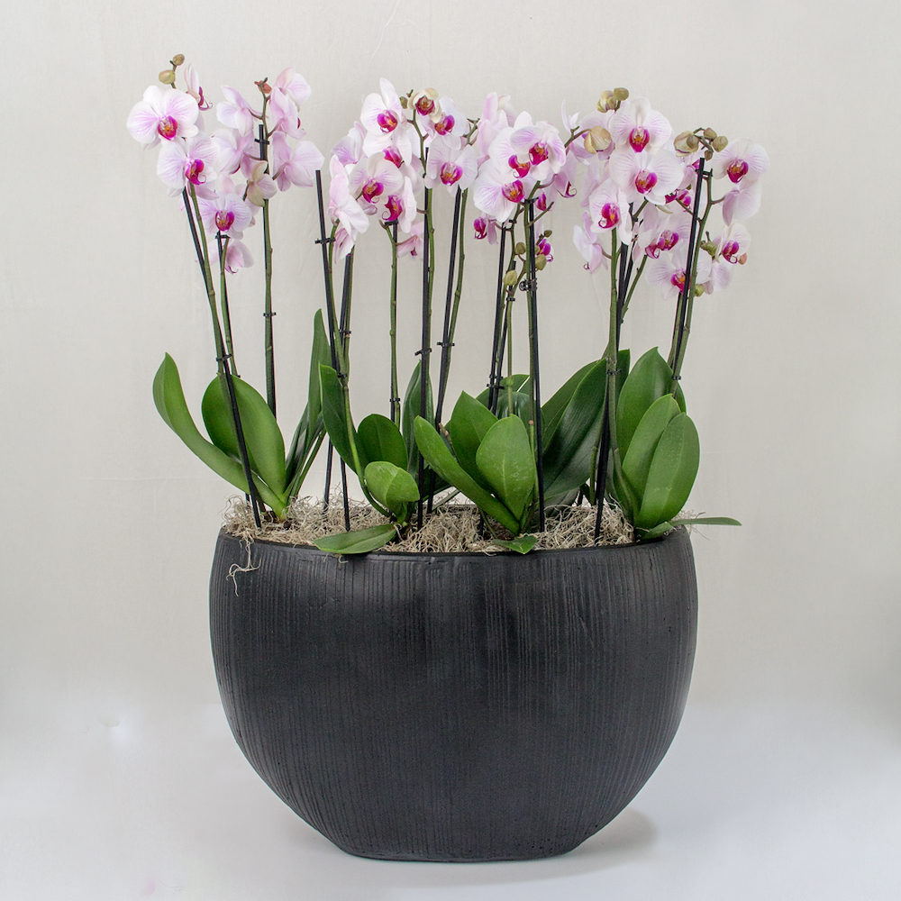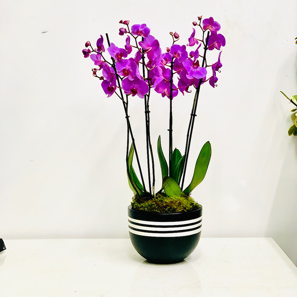 ترتيب مذهل من نباتات الأوركيد الأرجوانية في وعاء سيراميك مخطط باللون الأسود.