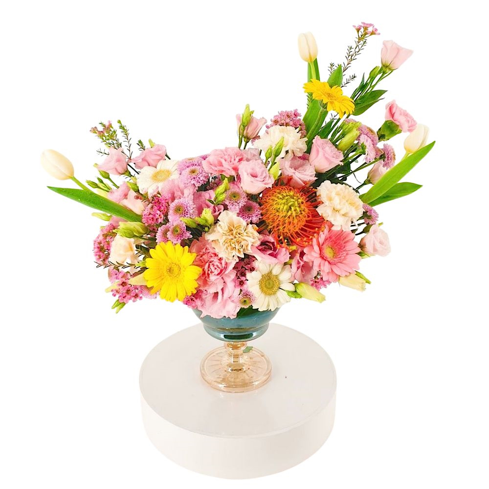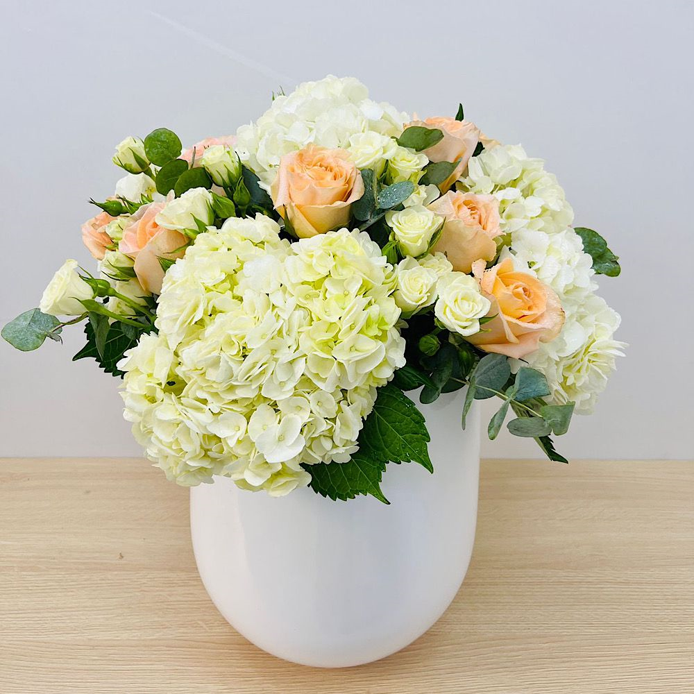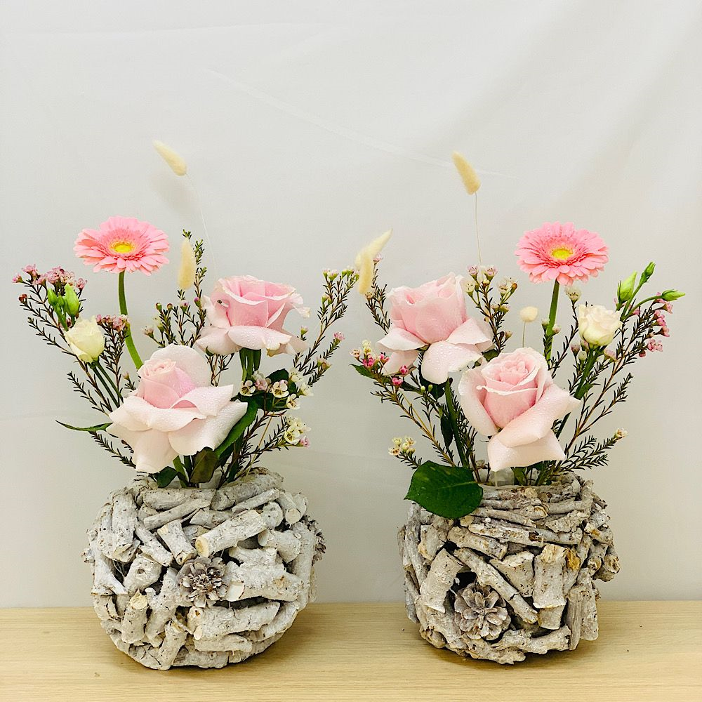ترتيب مذهل من نباتات الأوركيد الأرجوانية في وعاء سيراميك مخطط باللون الأسود.