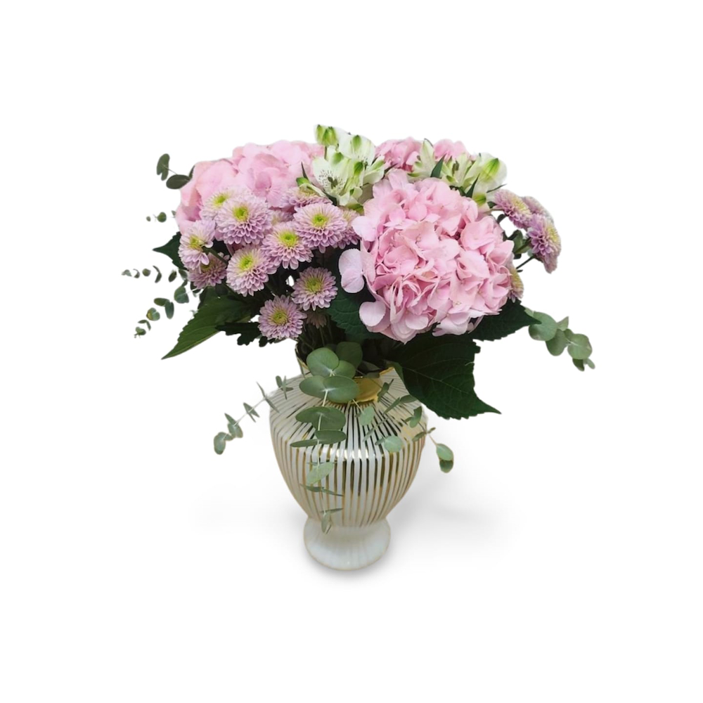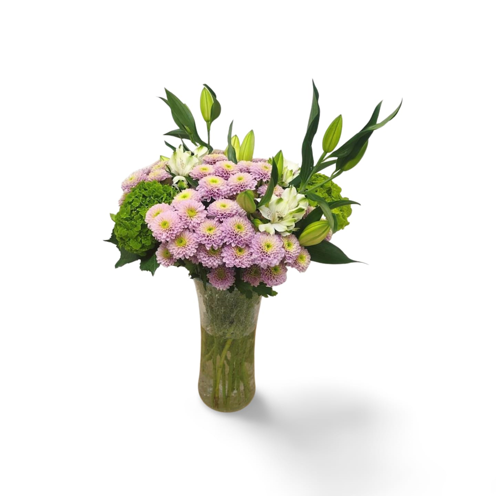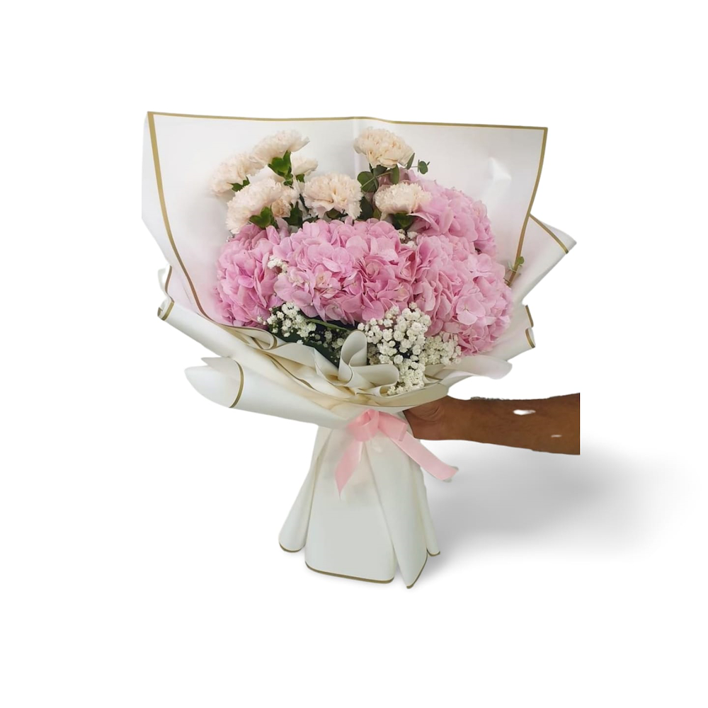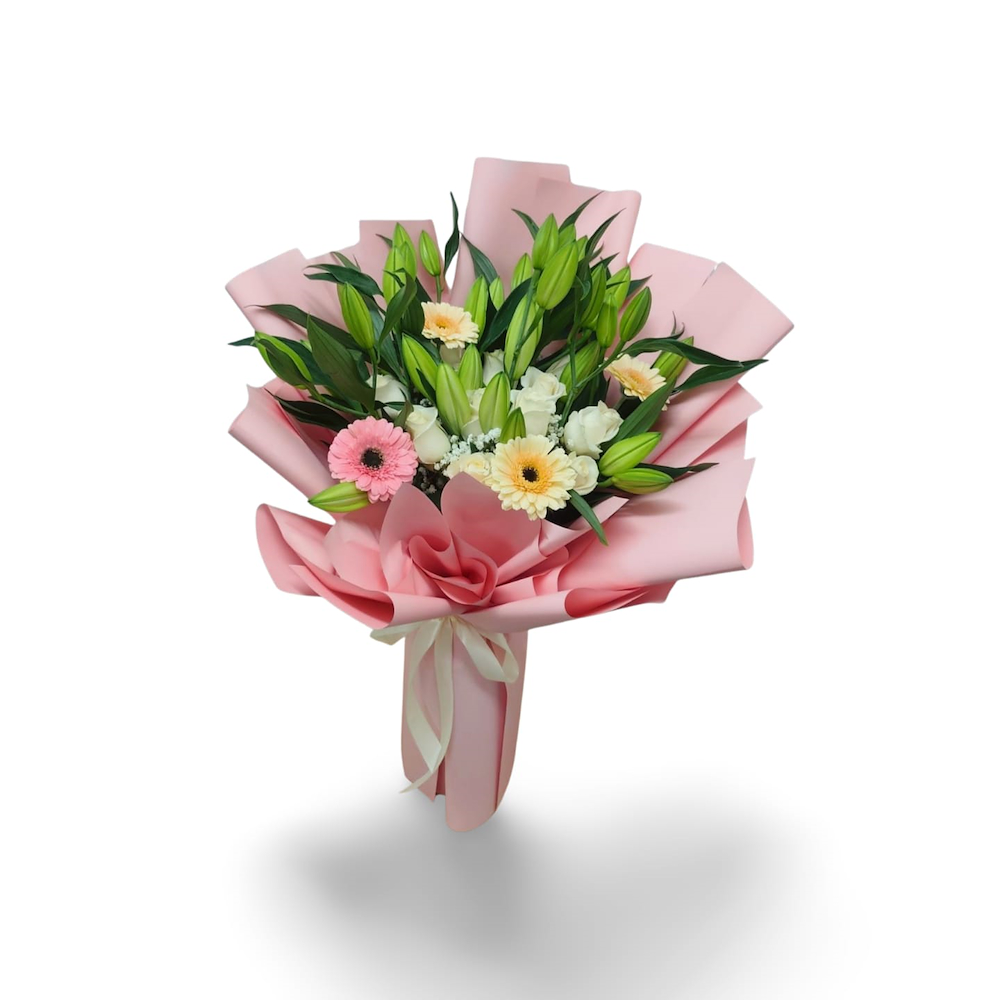 باقة يد تحتوي على الجوري، الجيربيرا والليليز.
