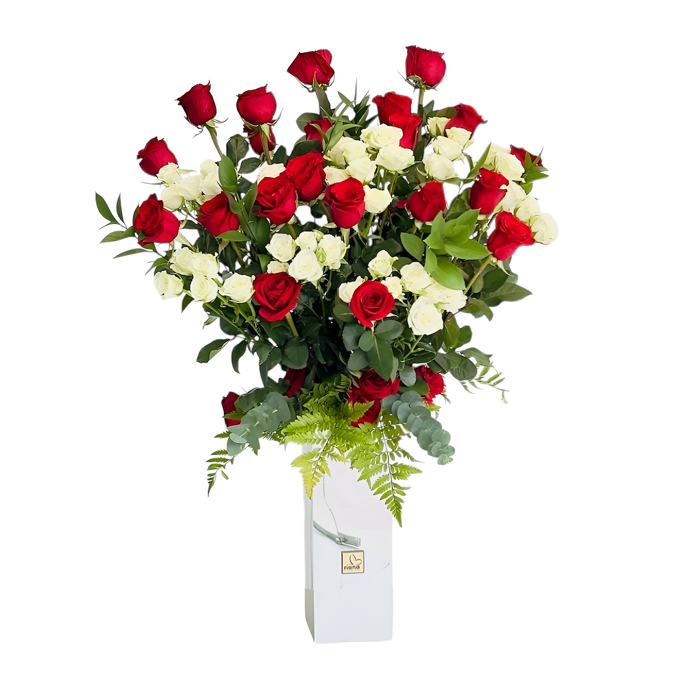 فازة تحتوي على الجوري، البيبي جوري واوراق اليوكالبتوس.