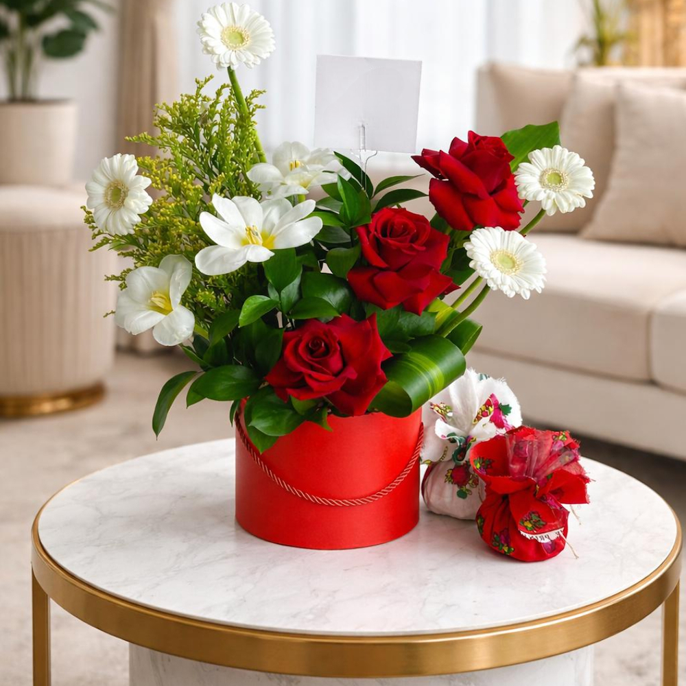 تنسيق زهور متوازن وجميل يضم جيربيرا حمراء، وليليز بيضاء، وكارنيشن أبيض، مع لمسات من أقحوان أخضر.