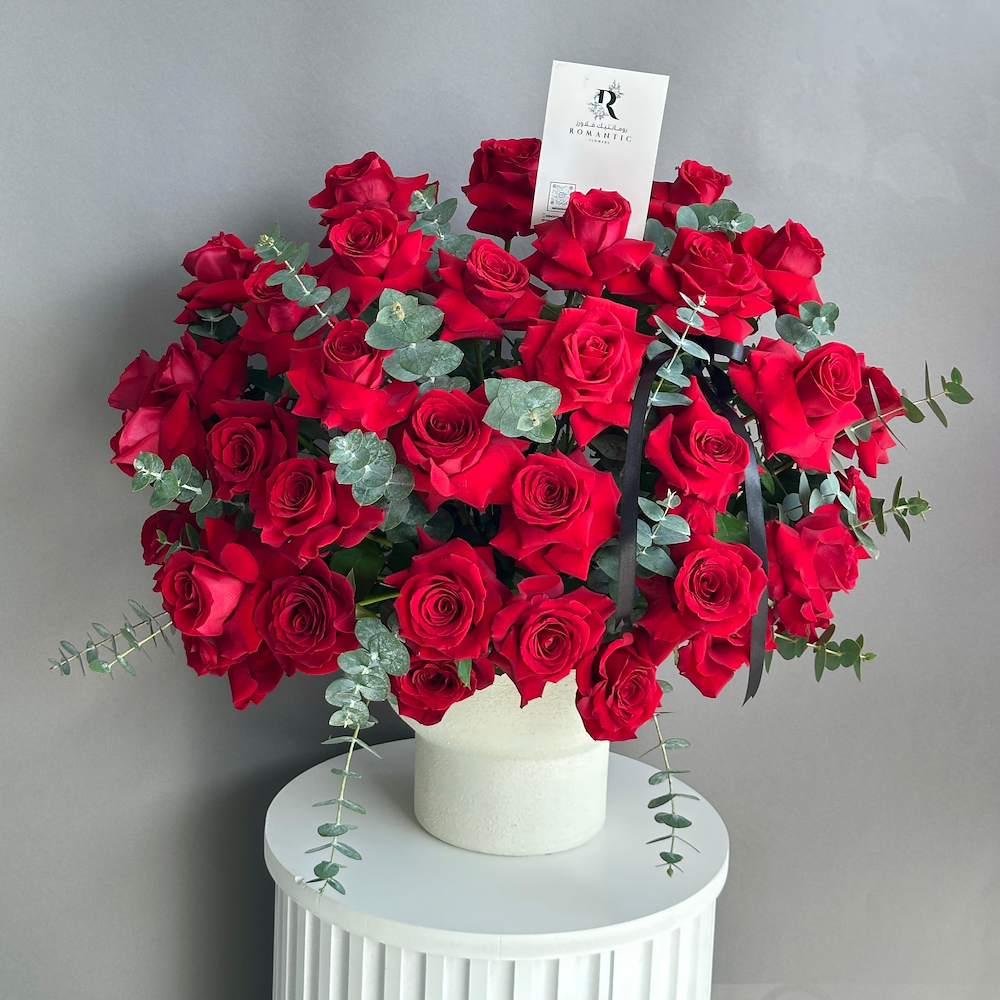 تنسيق فاخر وكلاسيكي من أجود زهور الجوري الحمراء مصمم بعناية داخل فازة بيضاء أنيقة، مع لمسات من أوراق الأوكالبتوس الخضراء لإضافة طابع طبيعي راقي. يعبر هذا التصميم عن الحب العميق والرومانسية والفخامة، مما يجعله هدية مثالية للمناسبات الرومانسية والإحتفالات والذكرى السنوية ولتقديم لمسة من الأناقة الراقية.